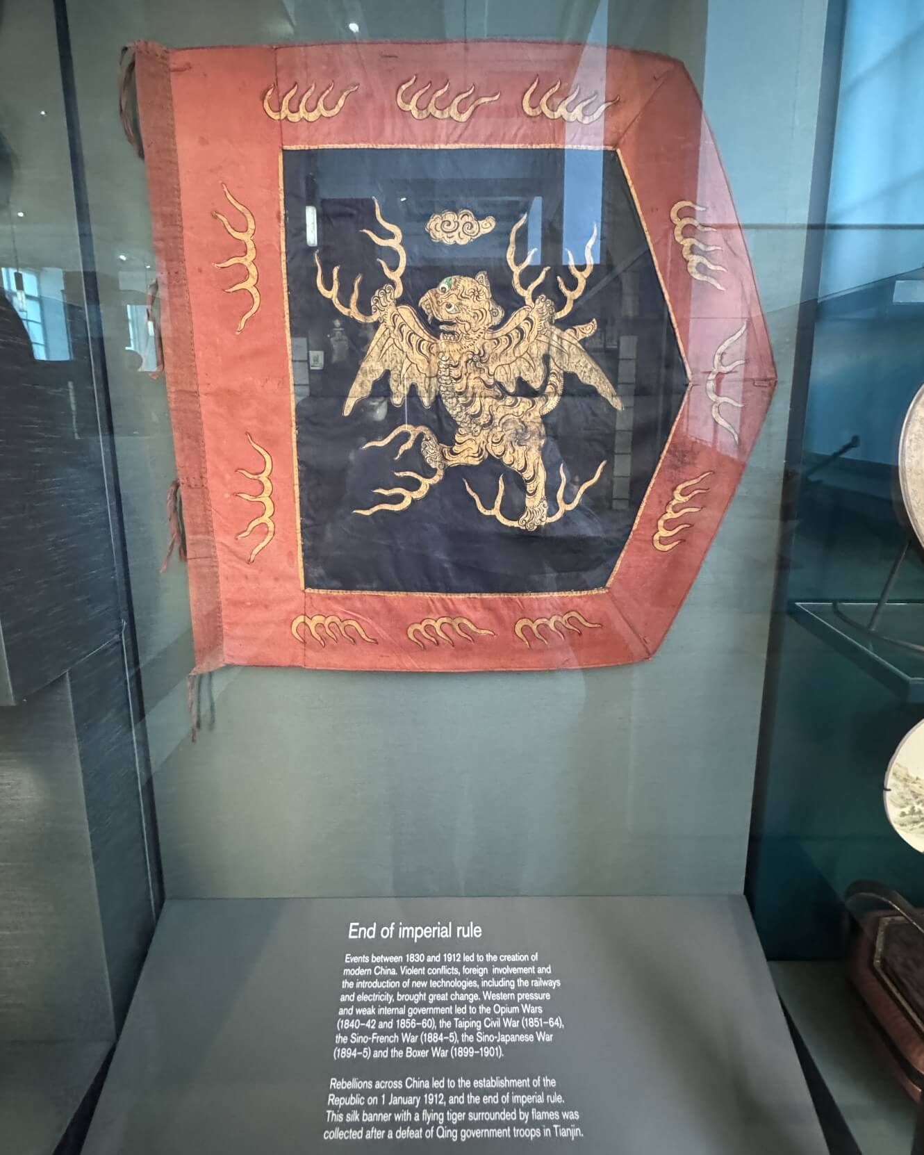 ↓這是一面清朝的官府旗幟,繡有飛虎的圖案,是1912年1月1日中華民國成立時,由天津的中國政府軍隊遞交給英國官員的六面旗幟之一,代表了中國帝制的結束,以及中華民國的建立,見證了中國歷史上一個重要的轉變時期。