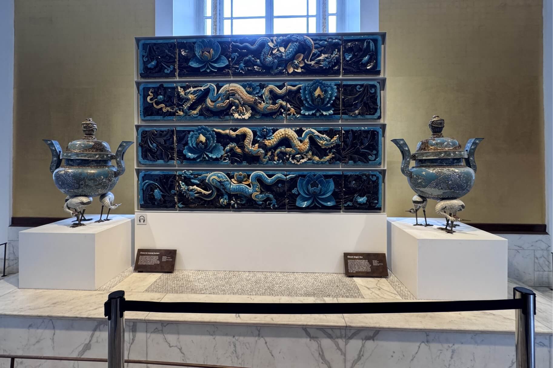 ↓乾隆皇帝使用的兩座七彩香爐,以象徵長壽的鶴為腳。釉面龍的磁磚牆,則是明朝祠堂或寺廟中所使用,以龍為主體,象徵吉祥。