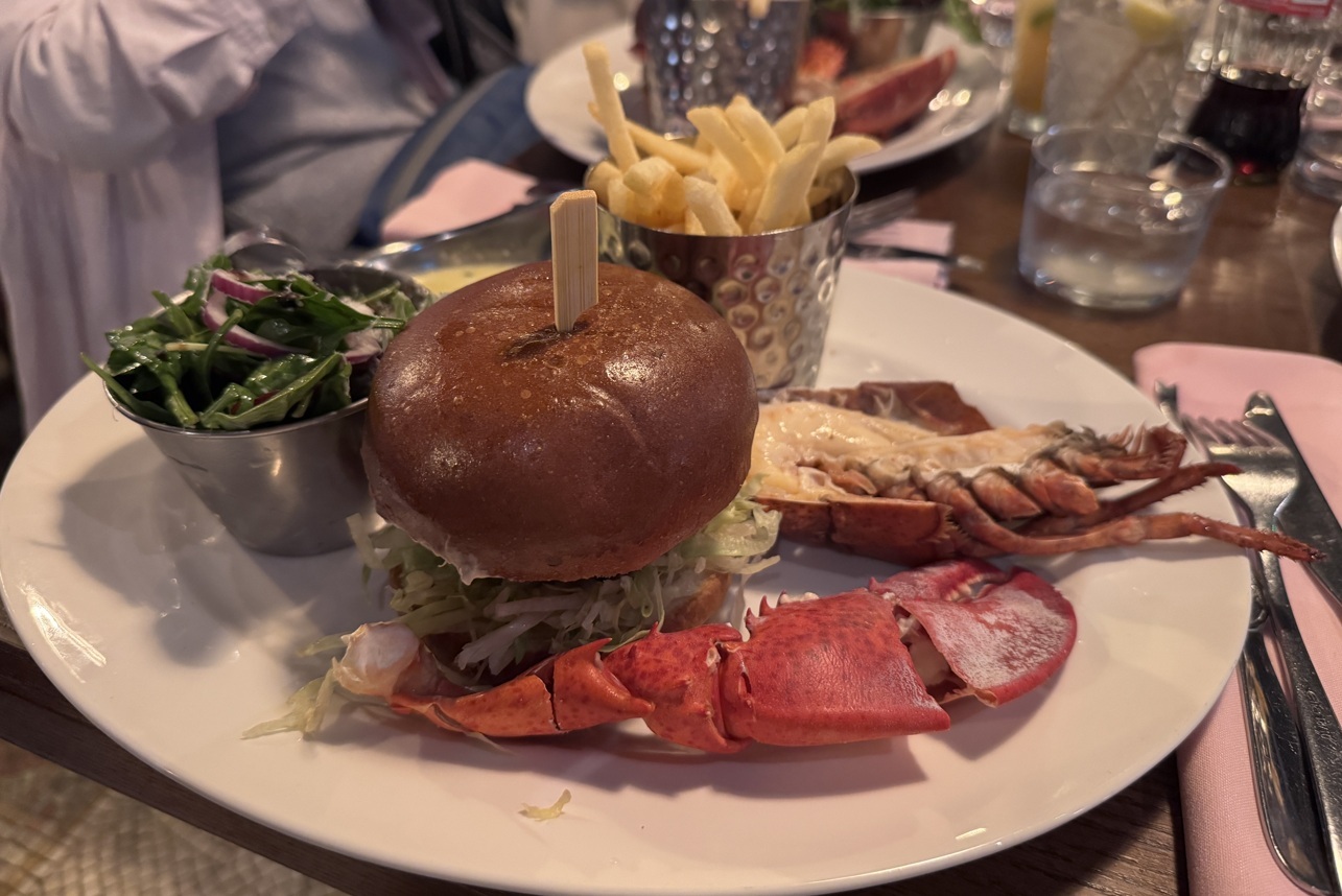 ↓今天吃的是火焰烤龍蝦(每人半隻)+豬排漢堡套餐,分量足,還有薯條。
