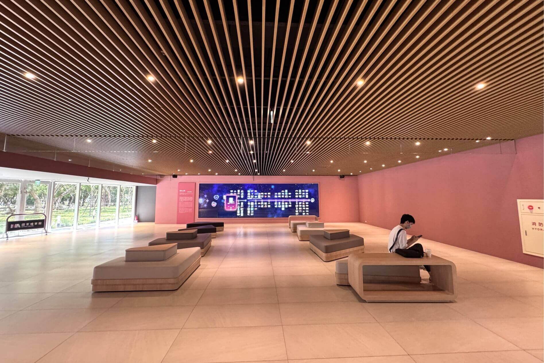 ↓前方除了有大型座椅外,牆壁上是一面互動式的圖像螢幕。左側光亮的落地窗,將園區的森林景觀納入眼簾。