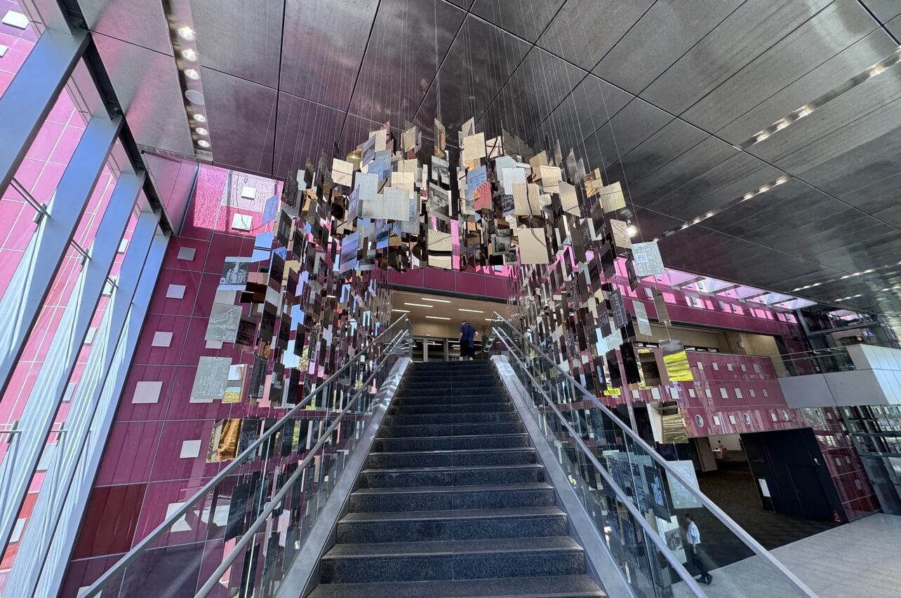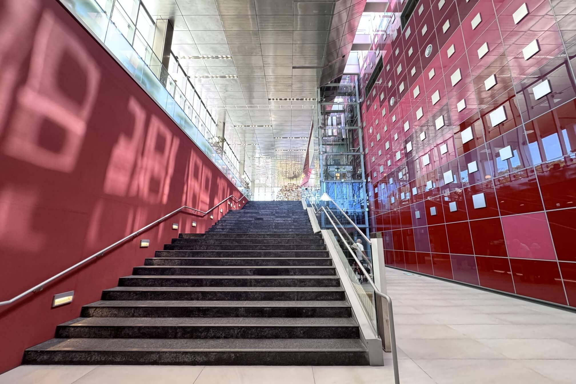 ↓一樓展示的資料並不多,準備爬上二樓,右側有一面藝術牆,映照出特殊的光影。從內容來看,國家檔案館是一座文物博物館;而從建築外觀及內裝來看,它則像是一座美術館。