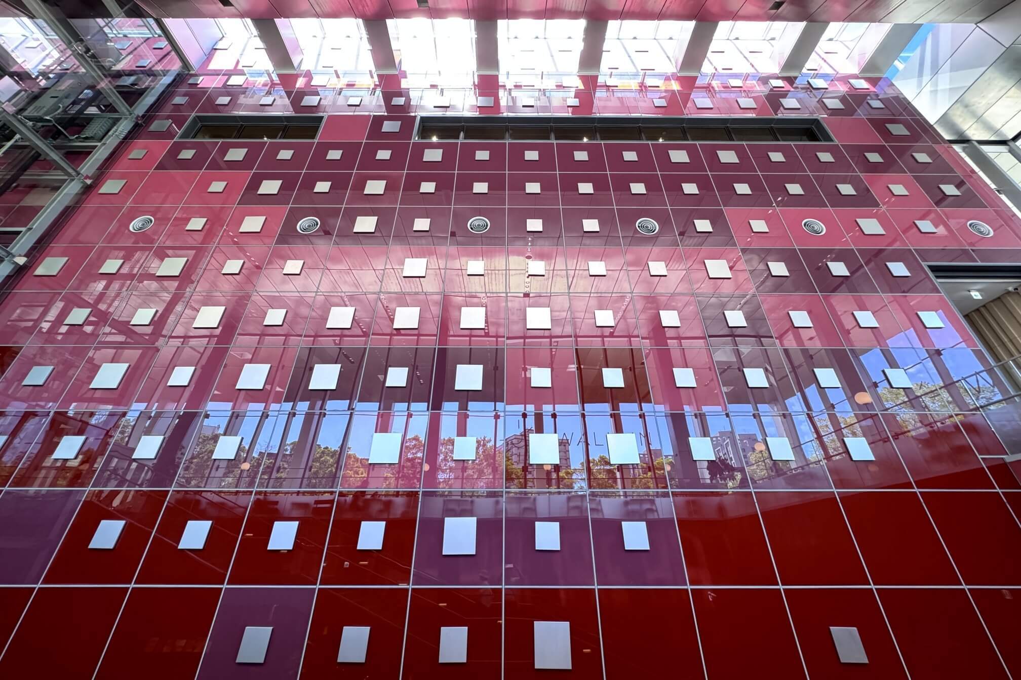 ↓這面牆如一面大鏡子,映照出後面的樹林及大樓。層疊無盡的湛紅烤漆玻璃磚,輝映著象徵林口的紅土沉積紋理。