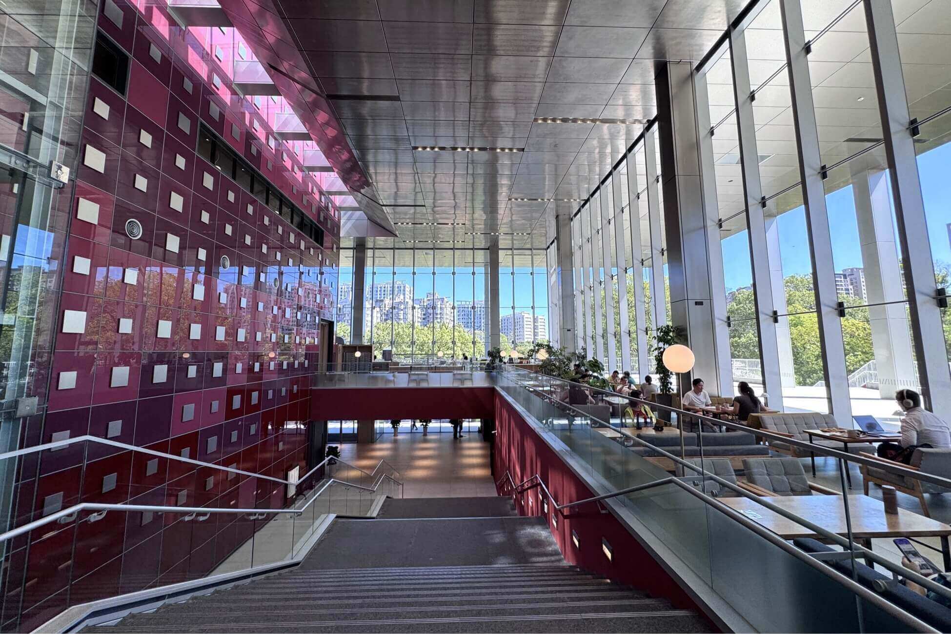 ↓從二樓回望剛剛爬上來的樓梯,右前方是館內唯一的餐廳,提供咖啡、飲品及簡餐。整個建築結構,非常有設計感,媲美「台南市美術館2館」。