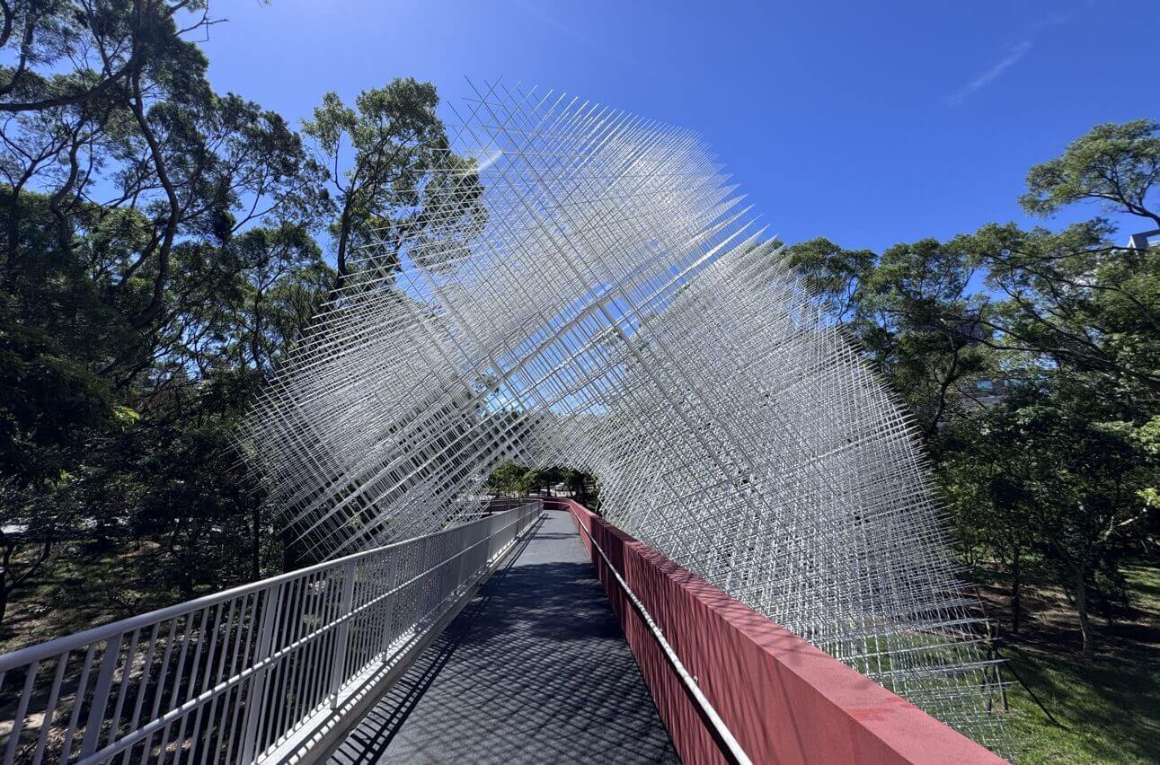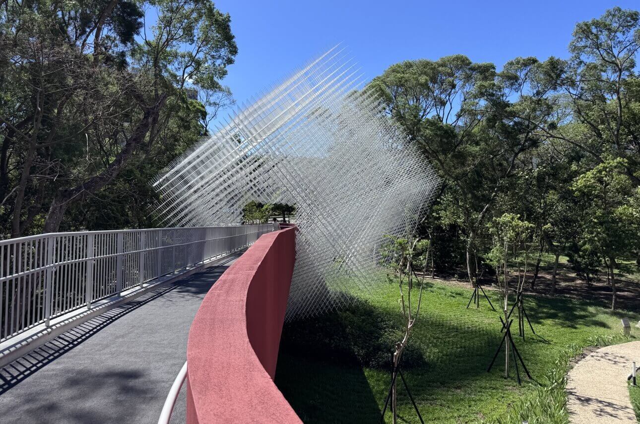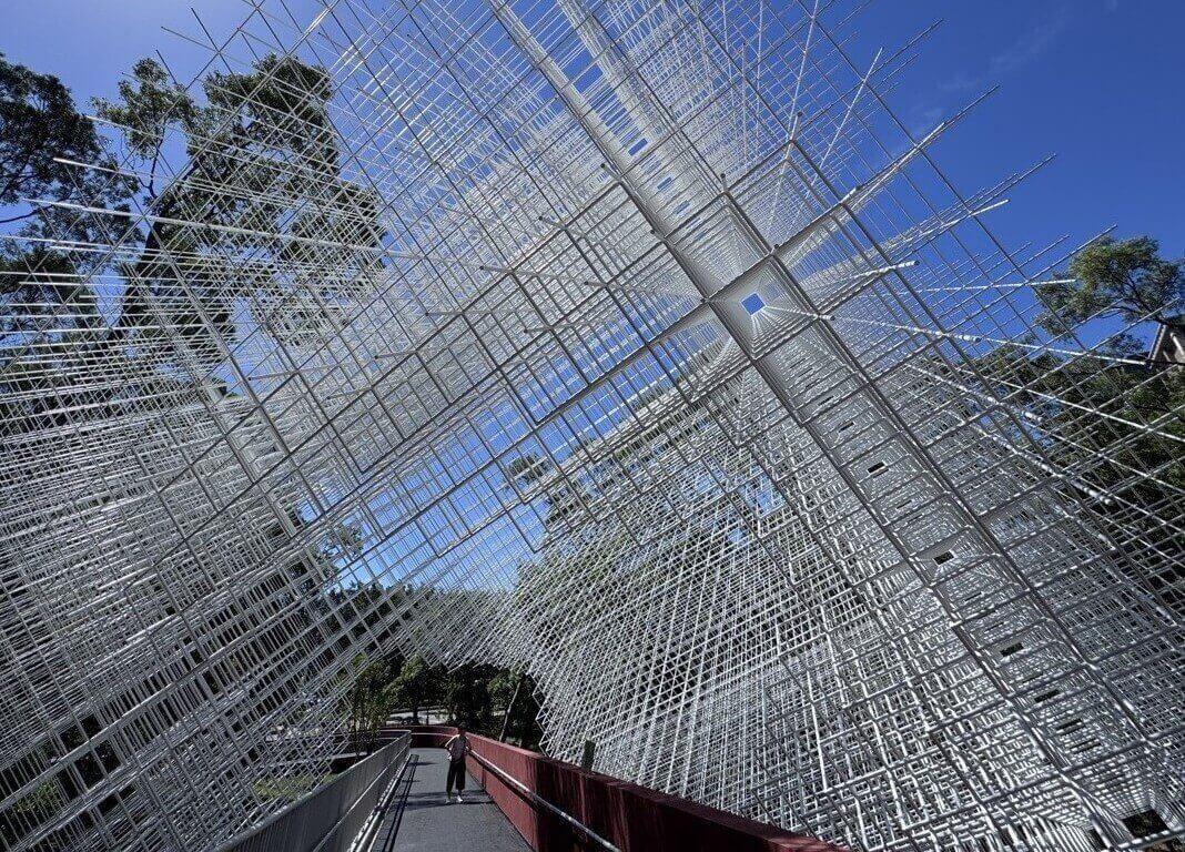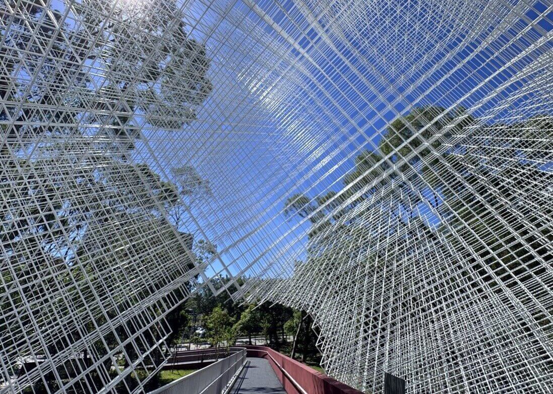 ↓天空廊道穿梭於綠林間,而這座裝置藝術則可依站位的不同,產生千變萬化的線條夢幻美。