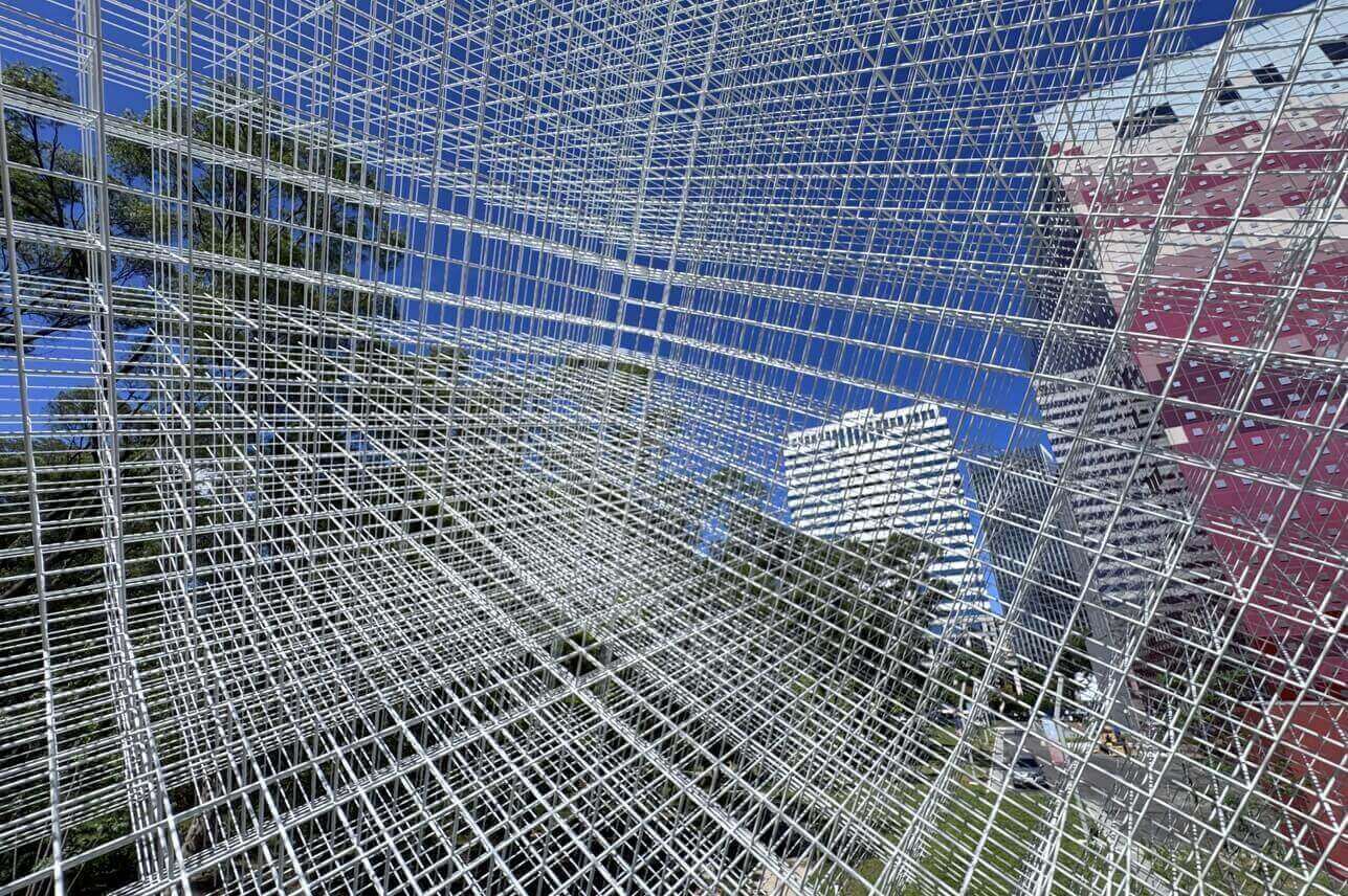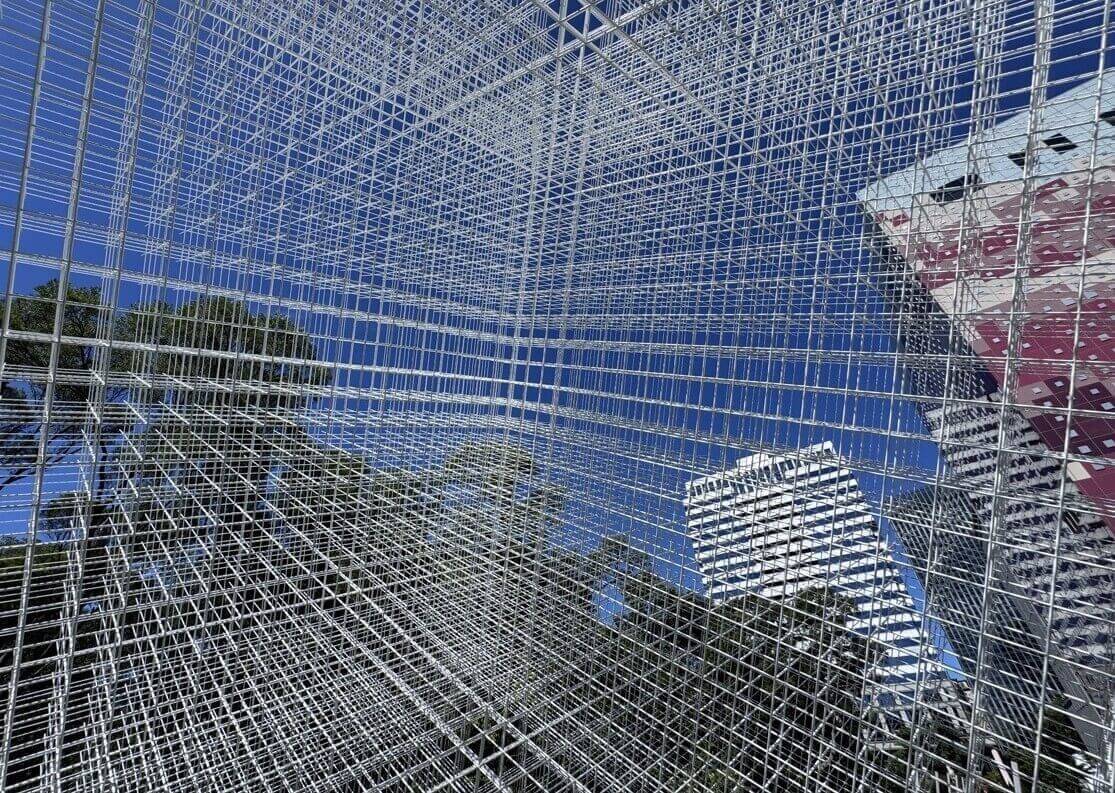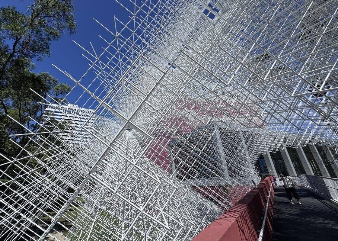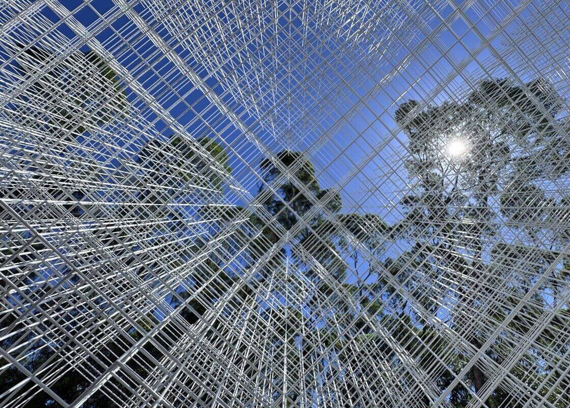 ↓天空廊道穿梭於綠林間,而這座裝置藝術則可依站位的不同,產生千變萬化的線條夢幻美。