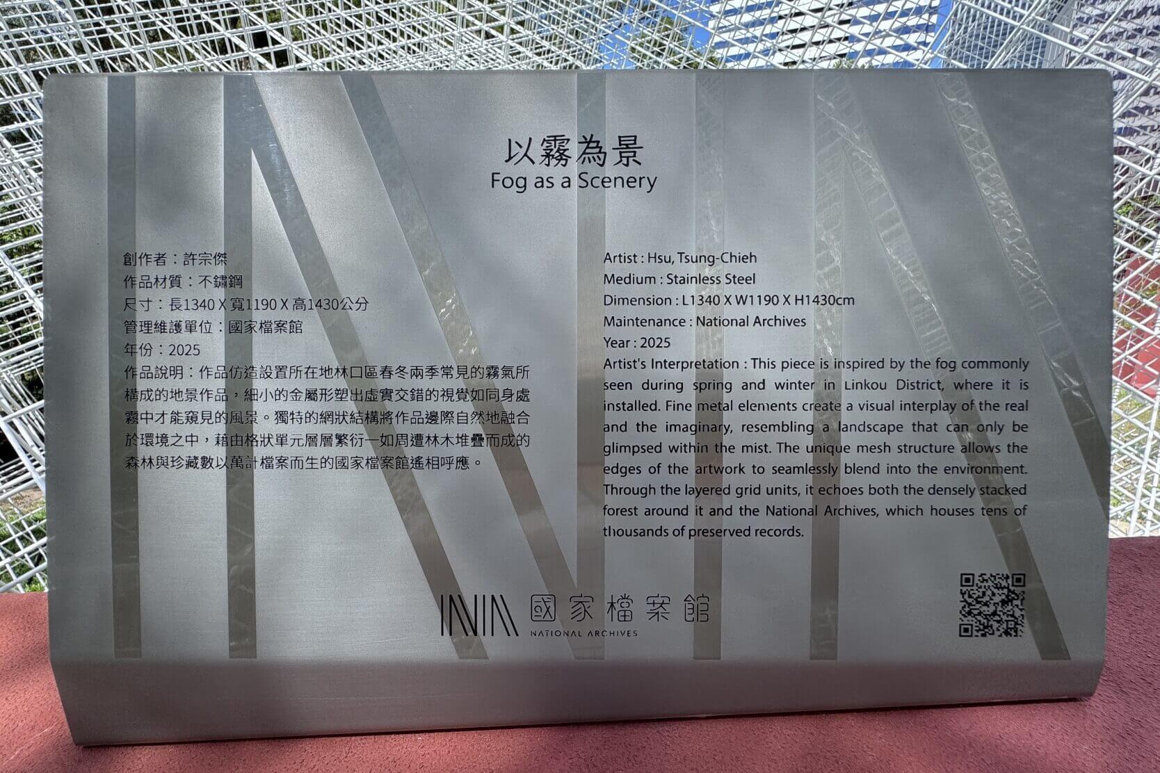 ↓這個裝置藝術,名為「以霧為景」,是以數萬計的不鏽鋼條所製成,以仿造林口地區秋冬多霧的意象為架構,也融入附近林木堆疊的森林。