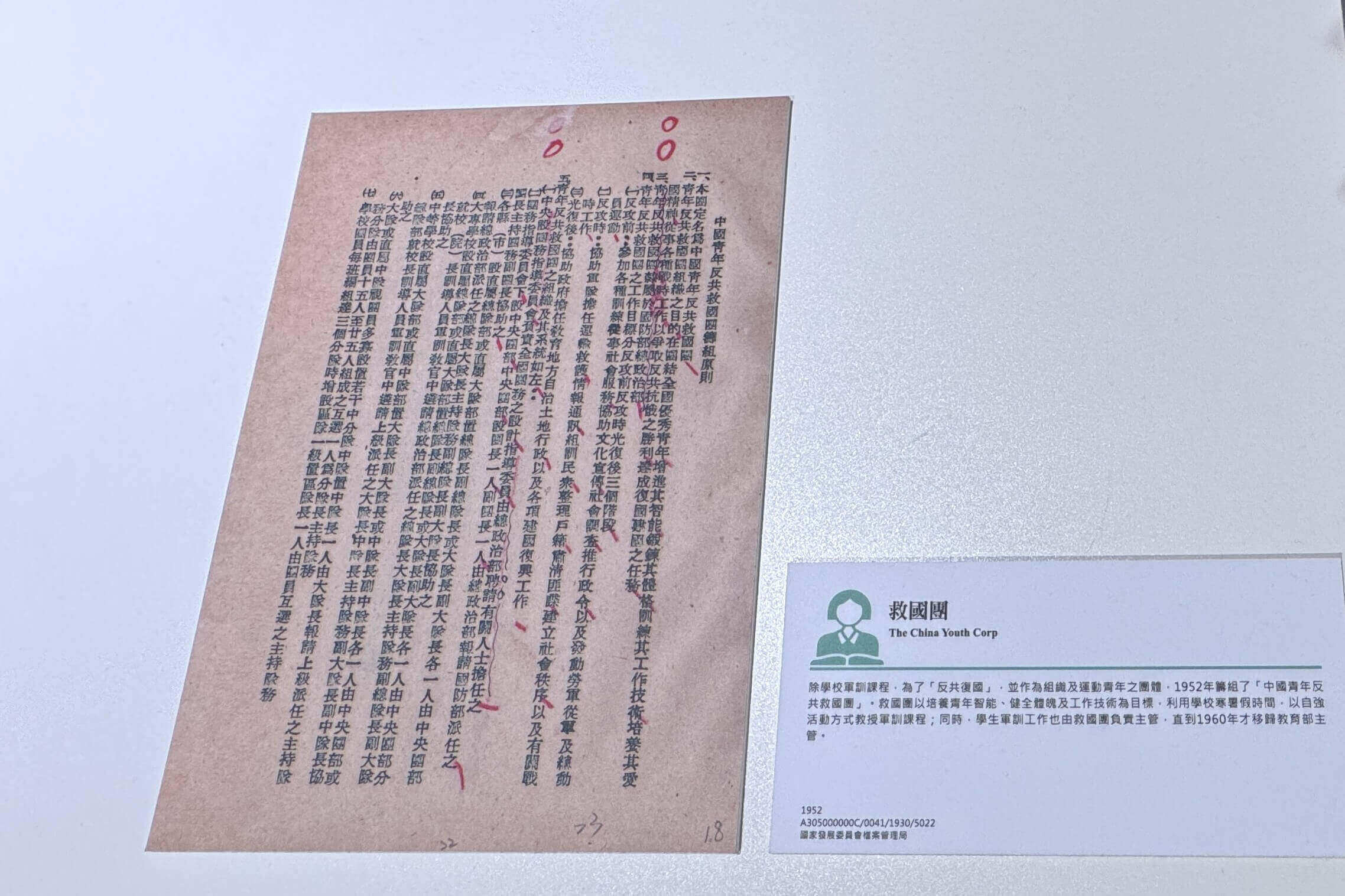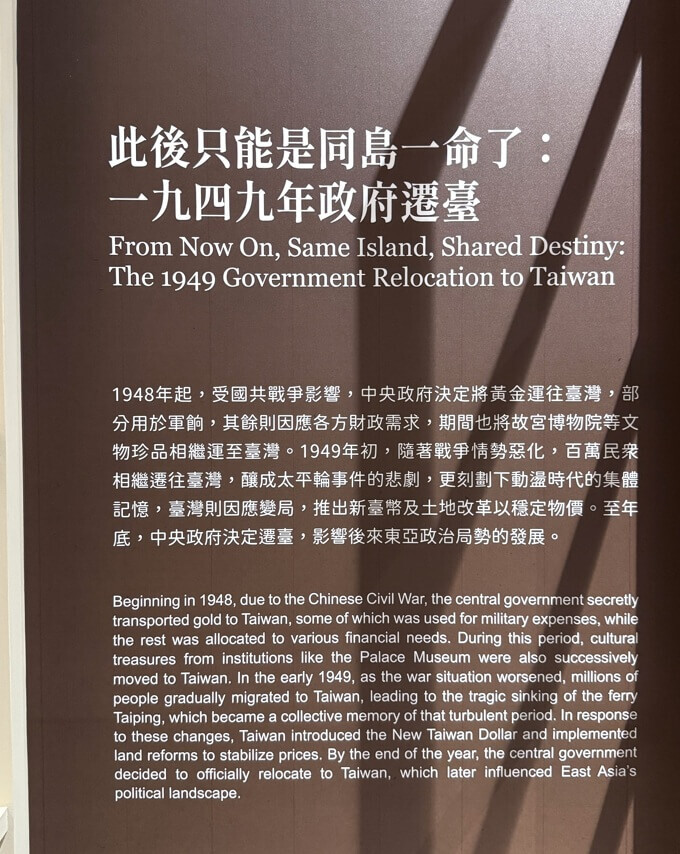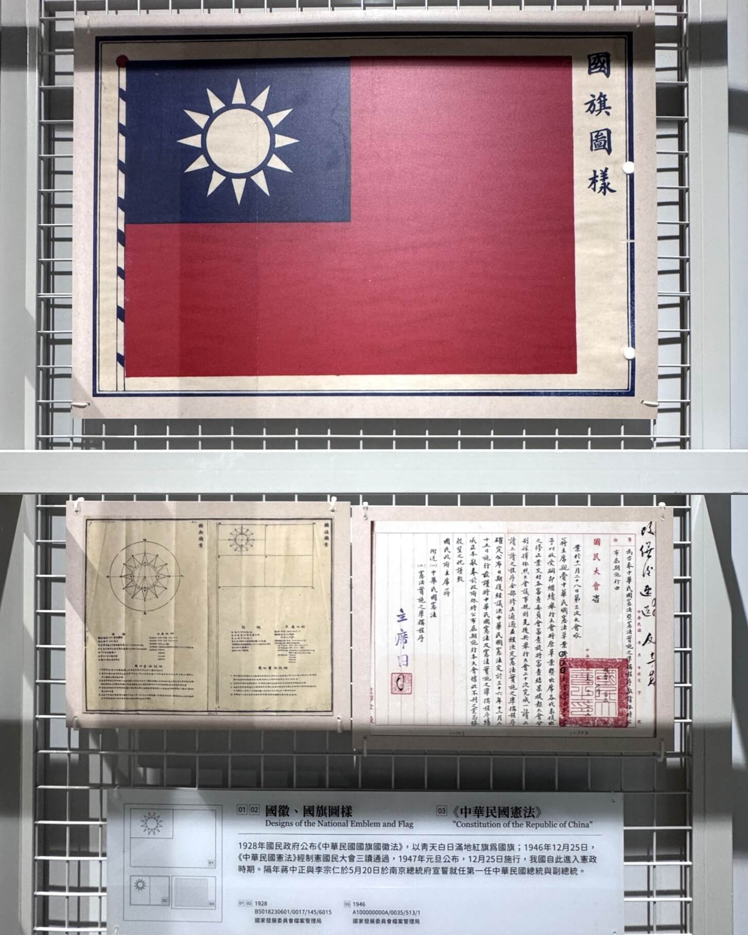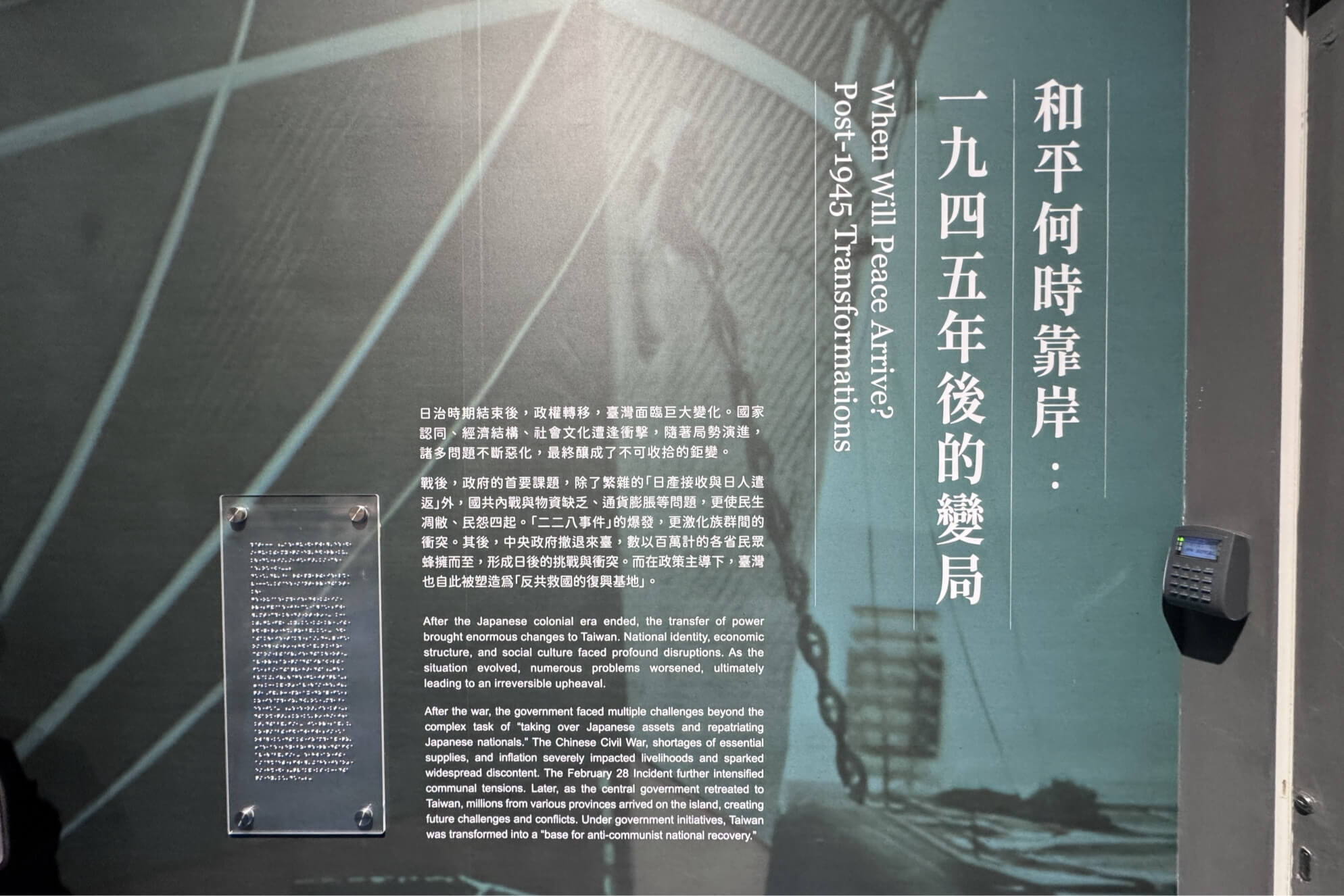 ↓國家檔案館中的展示,似乎以1945年台灣光復、結束日本時代後為主。當時國家確實面臨了重大的轉折,而1949年國民政府遷台,台灣成了「反共復國」的基地。館內的介紹,除了附有中、英、日文的介紹外,還有盲人點字的服務。