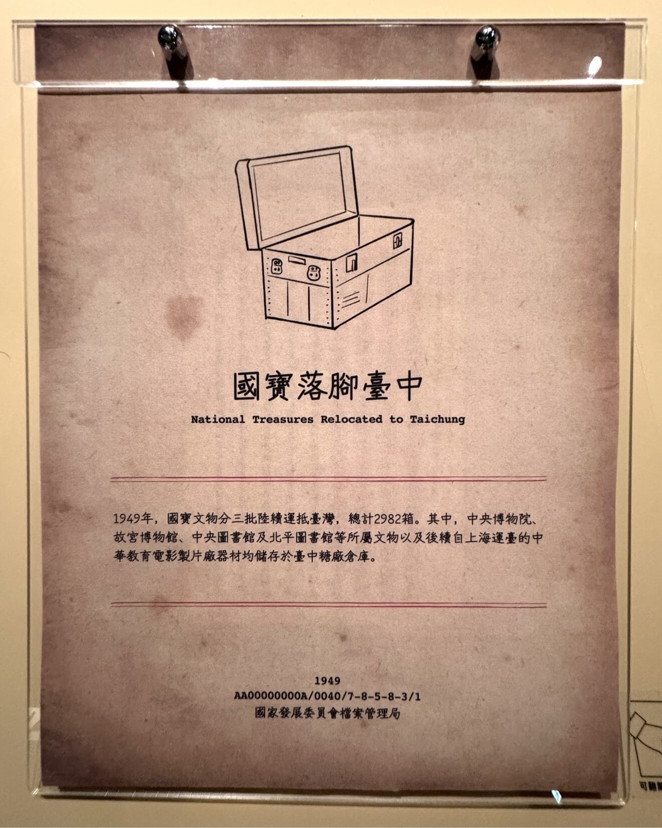 ↓國民政府撤退,做了幾個重要的決定,其中一項是運送國寶至台灣,當時共分三批、總計2982箱的國寶文物,陸續運送至台灣台中保存,免於「文化大革命」時受到破壞(點選連結文革時期文物古蹟損毁參考),保留了中華文化的傳承。