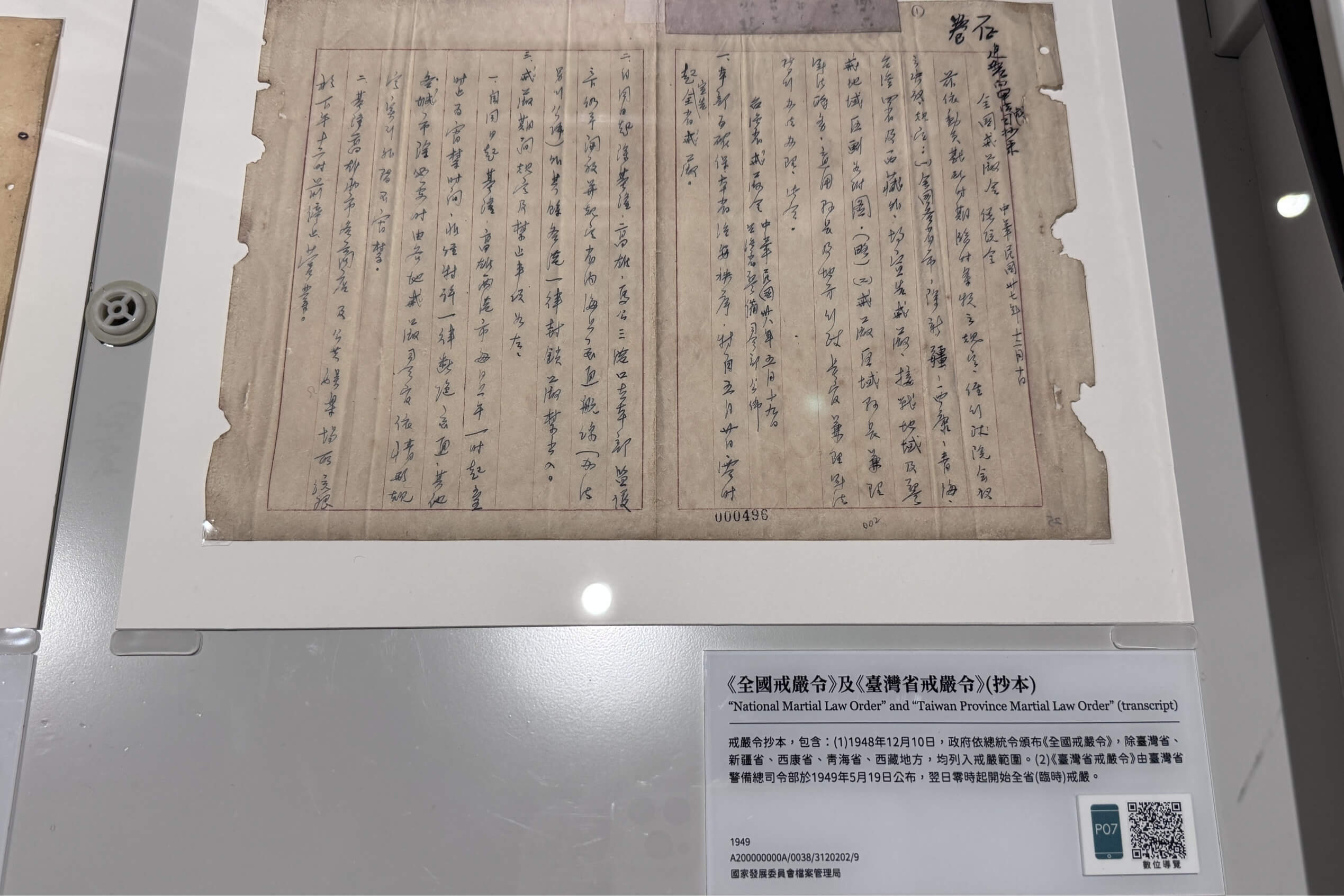 ↓這是「戒嚴令」的抄本。因為情勢動盪,1948年,國民政府還在大陸時,就曾公告《全國戒嚴令》,不過當時台灣與其他4個西南省份尚不在戒嚴範圍。1949年,《台灣省戒嚴令》公告,台灣開始進入戒嚴時期。