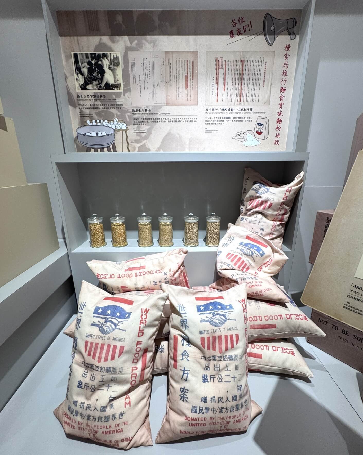 ↓許多老一輩的朋友,對美援麵粉袋都印象深刻。當時政府推廣食用麵食,推行「麵粉換穀」政策,以換取外匯,大量的麵粉自美國輸入。