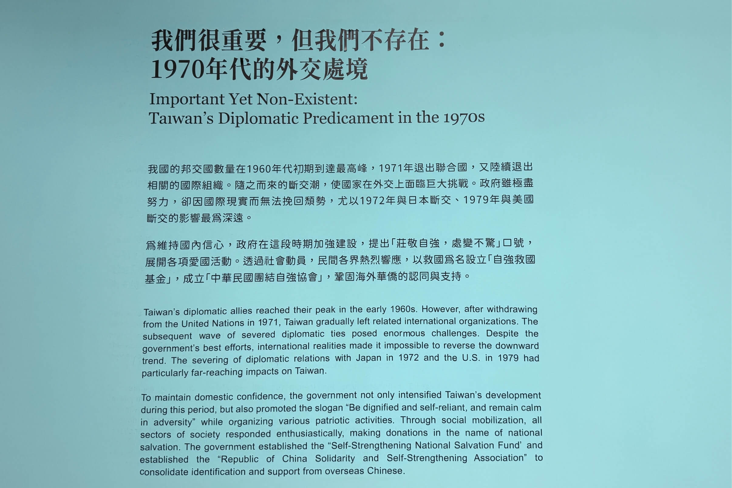 ↓我國的邦交國,在1960年代初期達到最高峰;然而,隨著1971年退出聯合國及相關的國際組織,斷交潮不斷襲來。1972年及1979年,日本及美國先後與我國斷交(與中共建交),都是我國外交史上的重大挫敗,影響深遠。