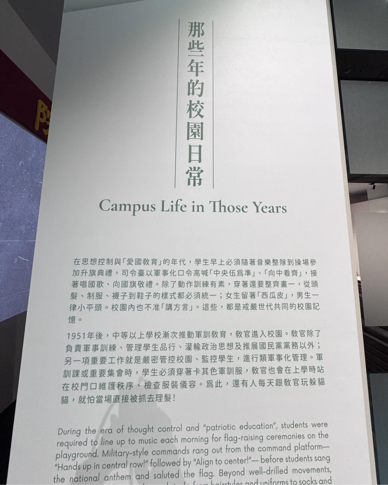 ↓戒嚴時期,從日常生活的食、衣、住、行、育樂等活動,皆受某種程度的管制,這裡特別提到在校園裡的管制,舉凡:升旗典禮、頭髮長度的要求(男生三分頭、女生西瓜皮)、制服衣著的規範(卡其服、裙襬低於膝蓋10公分)…等。