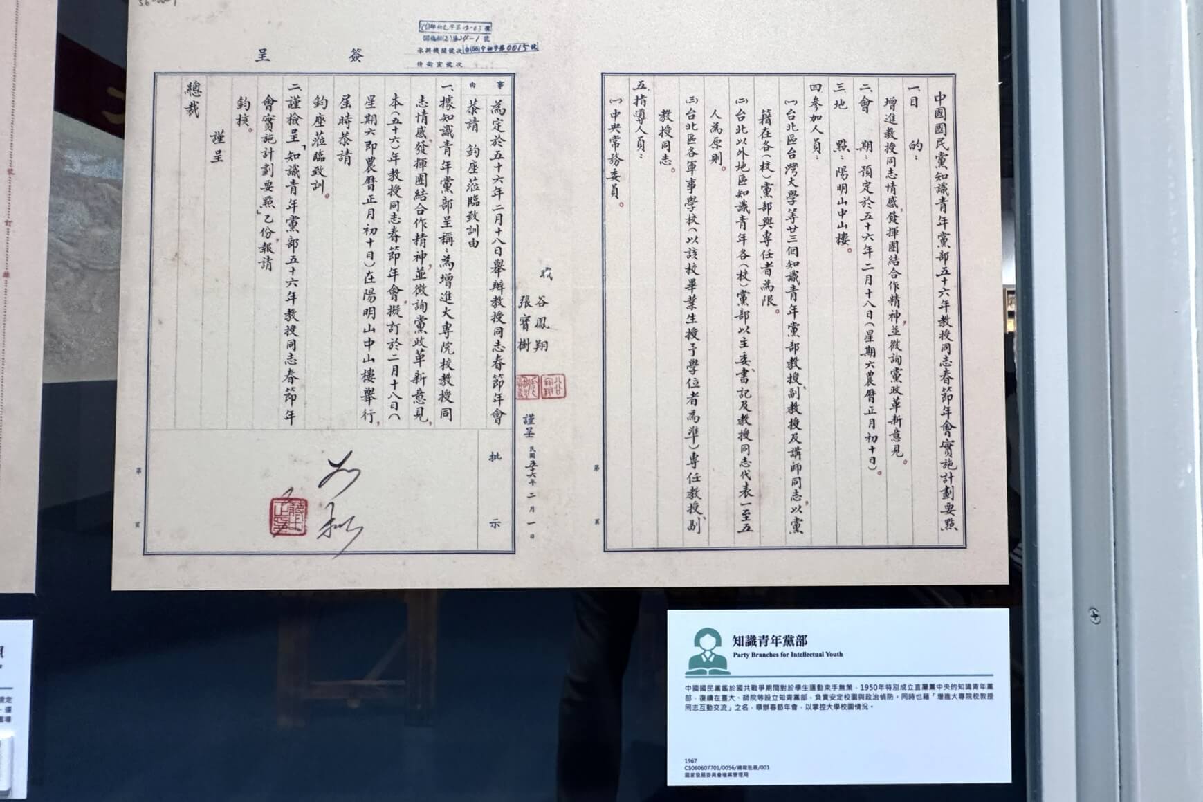 ↓中國國民黨在國共內戰期間,對學生運動束手無策,1950年特別在大學校園內成立「知青黨部」,負責安定校園與政治偵防。凱文高中時期曾為了將來當兵著想,在教官的慫恿下入黨,進大學後,自然也是知青黨部的一員。