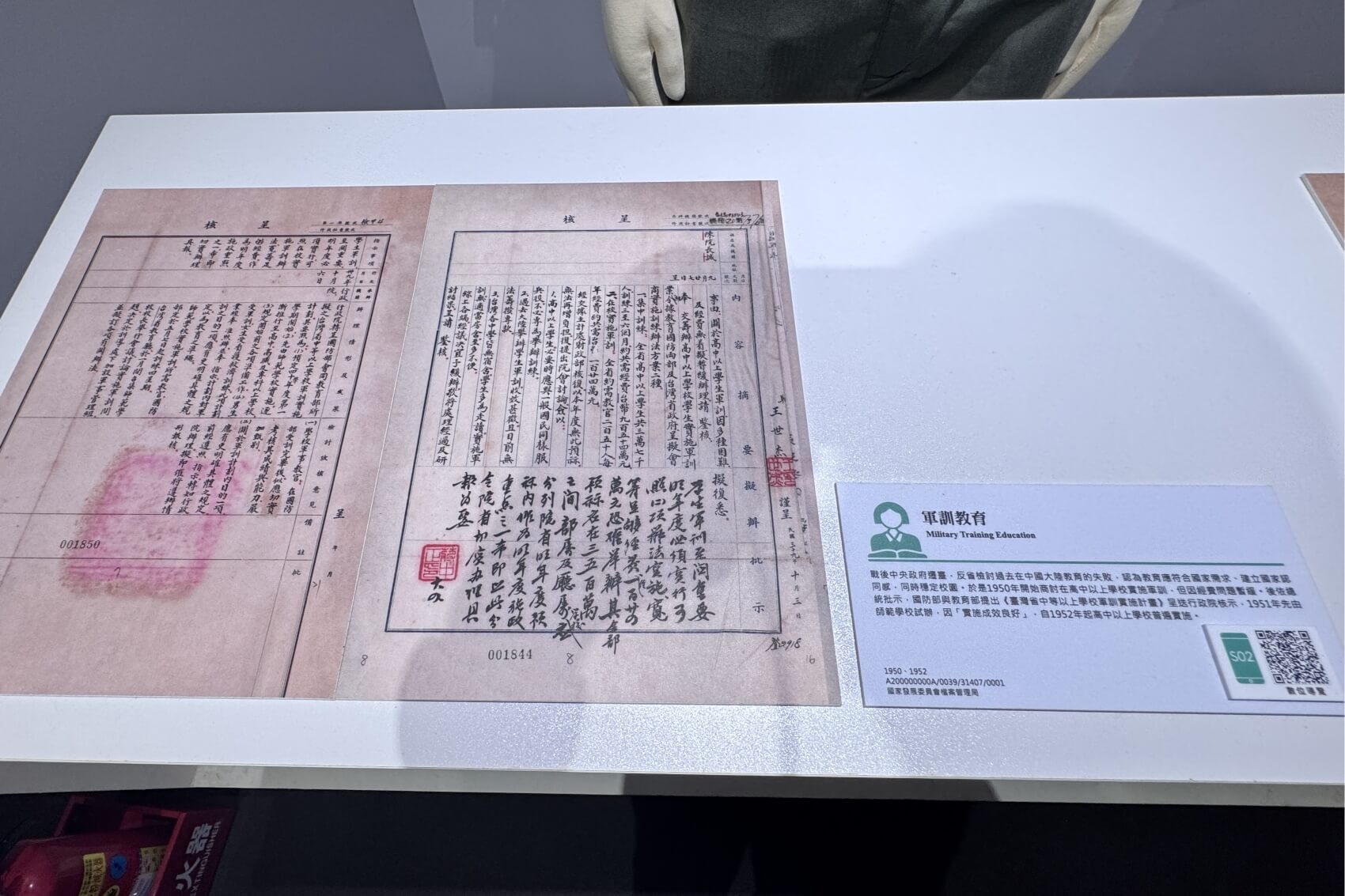 ↓政府遷台後,檢討過去在中國大陸教育的失敗,便於1952年起,全面在高中以上的學校實施軍事教育,除了設置軍訓教官外,也開立軍訓課。記得高中時期唱軍歌比賽是每學期的重點活動,大家也第一次(女生是唯一一次)體驗打靶。