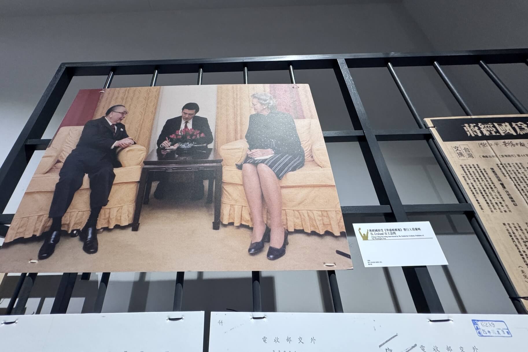 ↓1986年10月7日,總統蔣經國接見美國《華盛頓郵報》的發行人葛蘭姆(Katherine Graham)時表示,為積極推行民主化,台灣在短期內會解除戒嚴及開放黨禁,成為台灣民主化的重要宣示。照片中擔任翻譯官的是前總統馬英九。