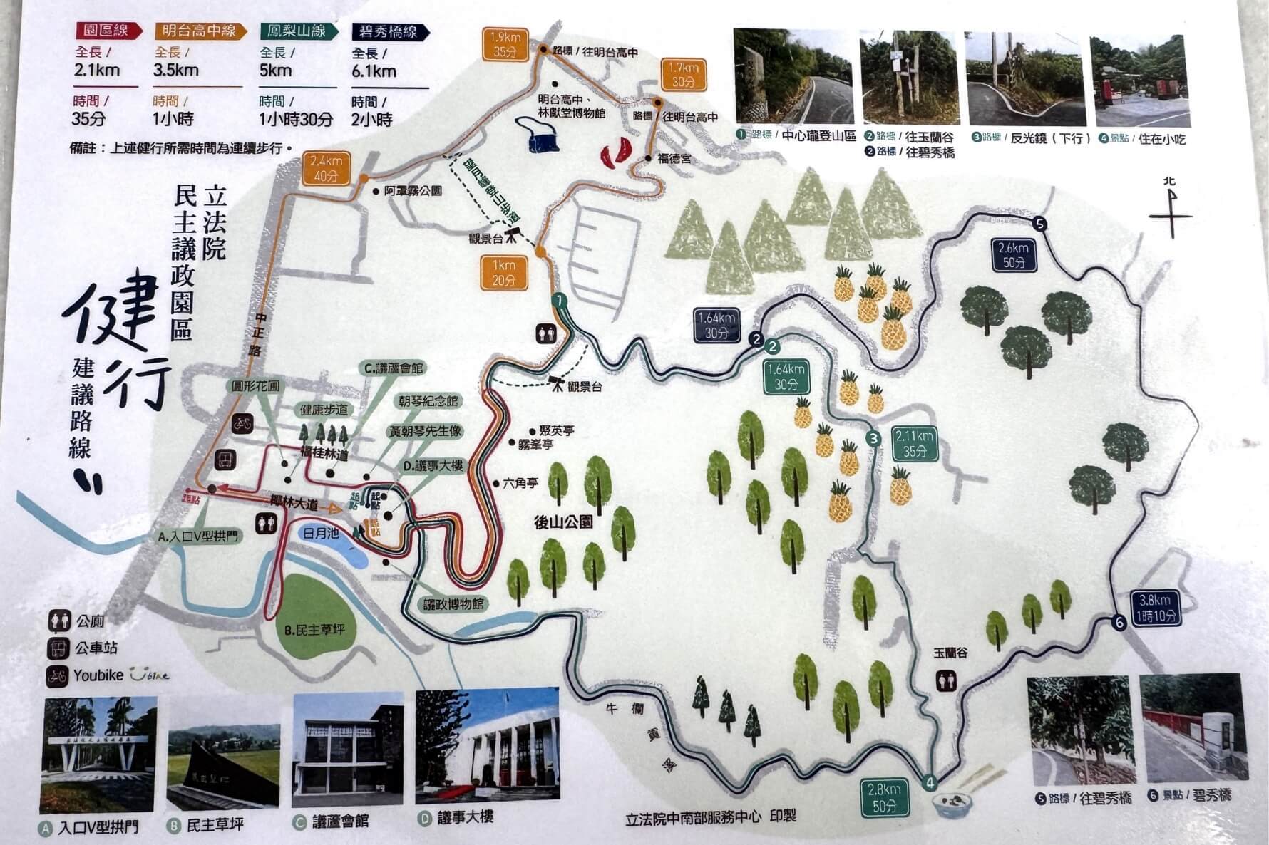 ↓地圖左邊是立法院民主議政園區,右邊則是後山「明台後山」。步道有許多路線及入口,我們預計走3號路線(鳳梨山線),從「中心瓏登山步道」開始,總長約5公里。