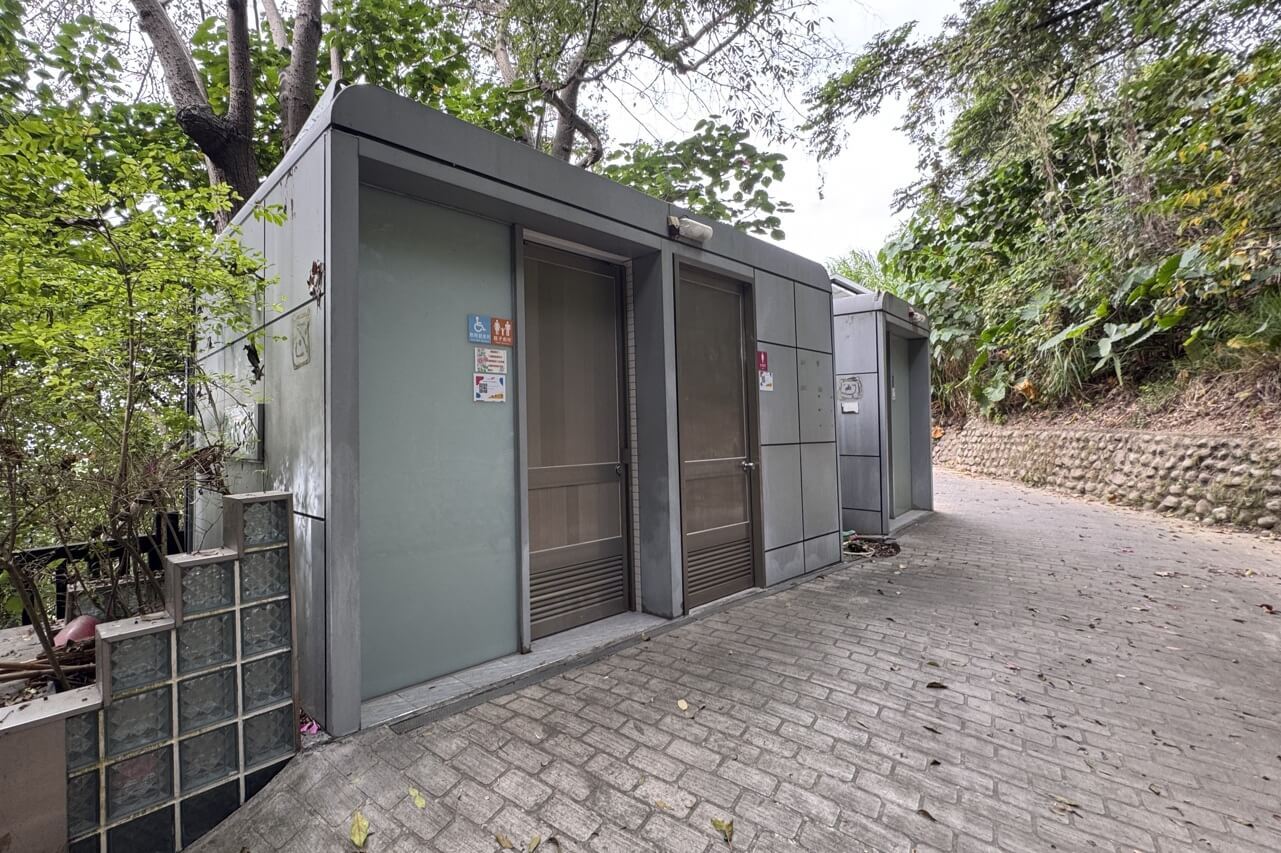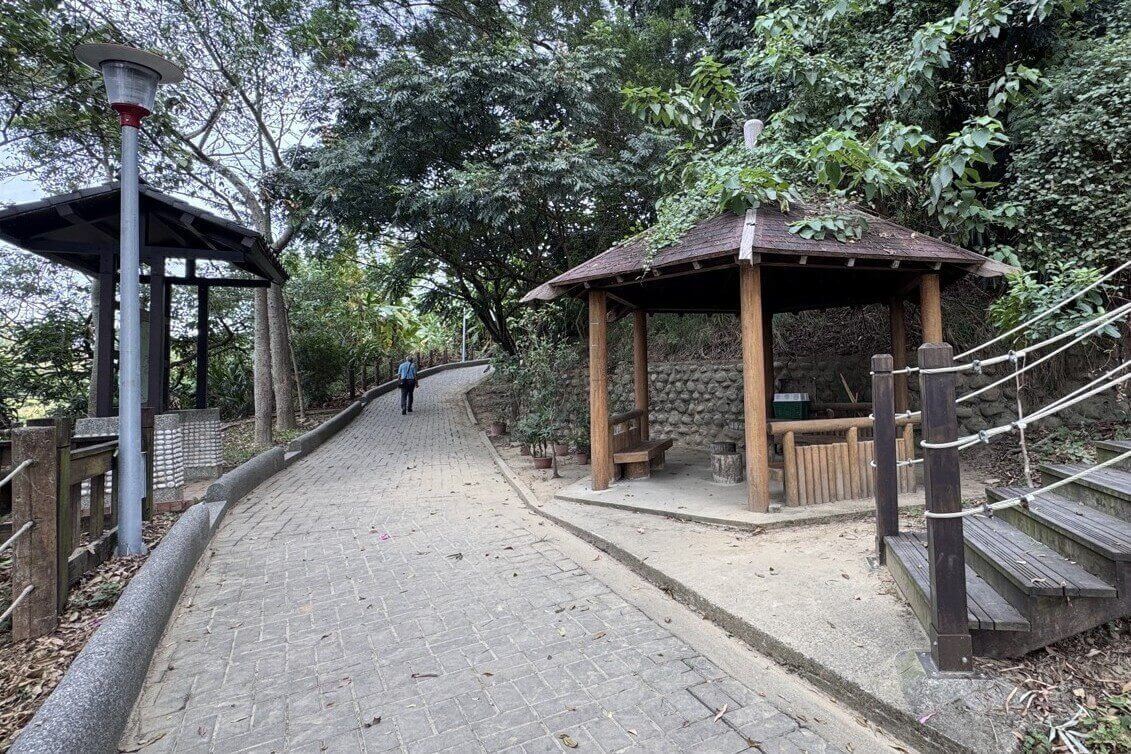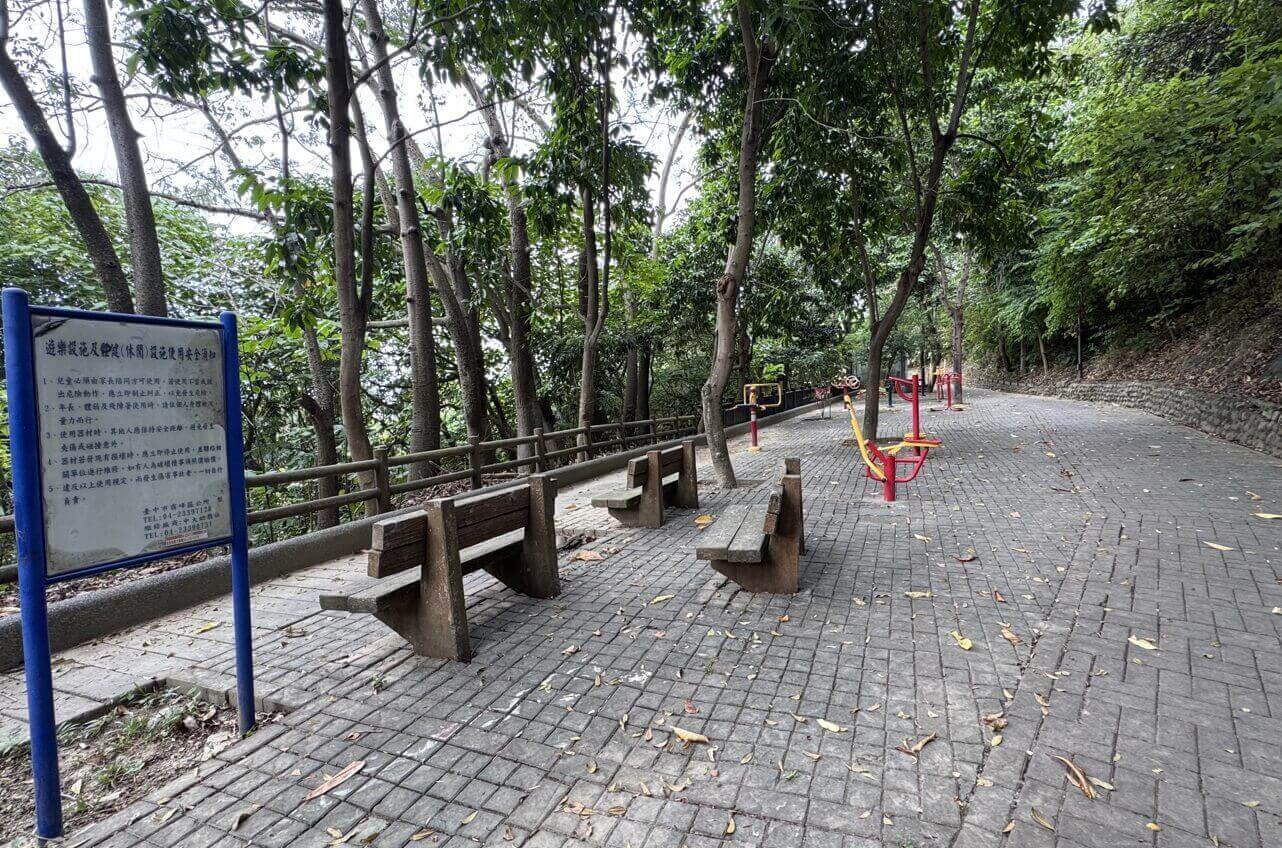 ↓前方有另一處休息區,不過前方樹木太高大、密集,幾無景觀。旁邊有健身設施,可供晨昏來爬山的鄉民運動一下。