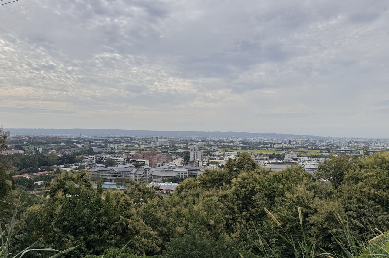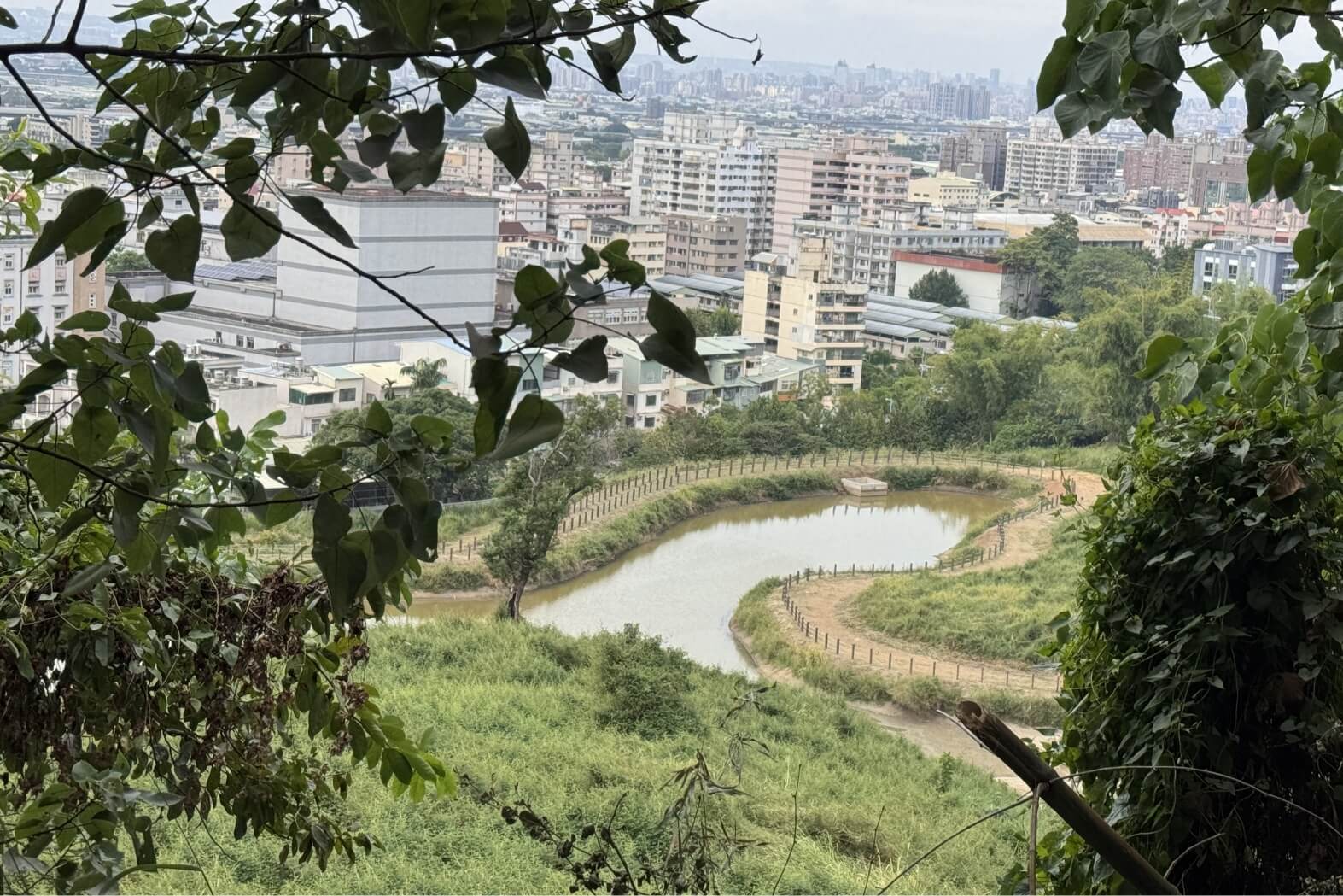 ↓沿途有多處景觀可賞,前方密密麻麻的建築物,是霧峰的市中心。下方池塘,外觀像一座太極。