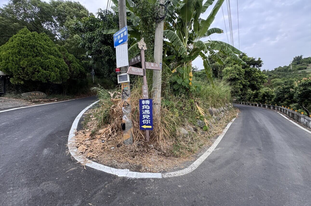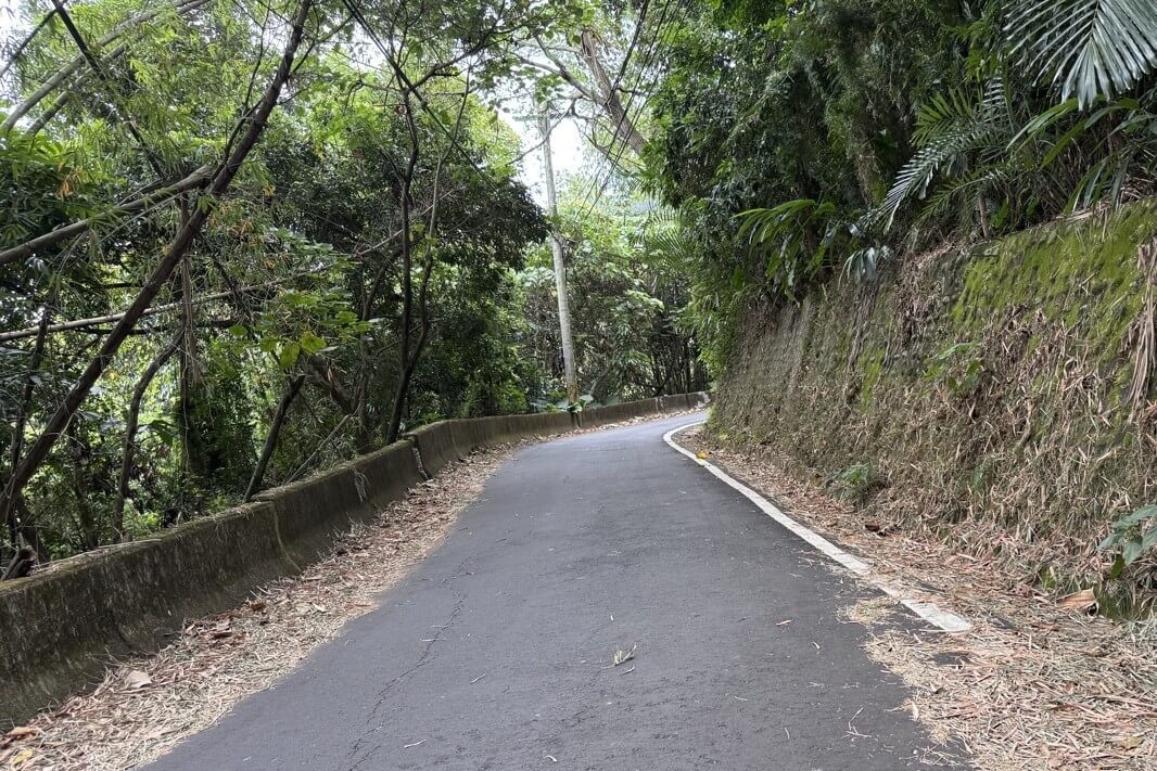 ↓我們從三叉路口,沿著產業道路往上繼續爬後山。沿途有多處休憩點,也有數個『誠實小站』,農民放著各種蔬果農產品,寫著價錢,登山客喜歡的話,可以自行投錢,帶走農產品,真是有人情味的社會,可惜沒拍下誠實小站的照片。