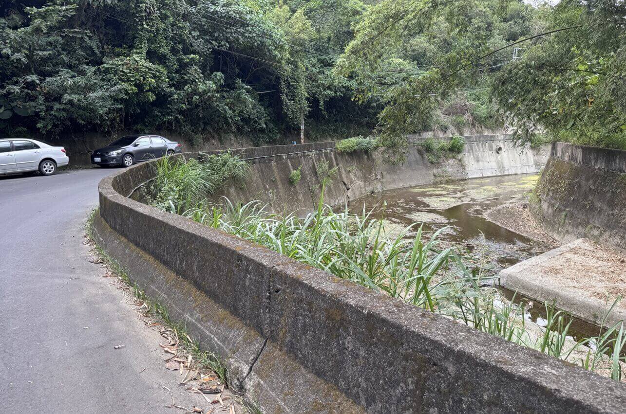 ↓經過一段陡坡後,來到緩坡的產業道路,依著旁邊的「牛欄貢溪」走。牛欄貢溪是中部重要河流「烏溪」的上游;立法院民主議政園區內的「日月池」,池水即源自牛欄貢溪,「日月池」正整修圍籬中,我們這次無緣入內觀賞。