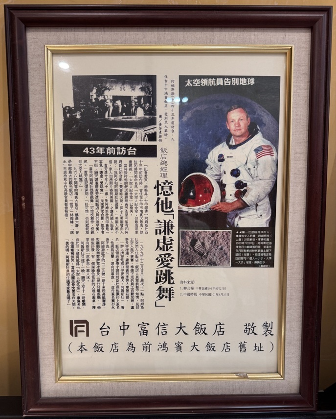↓我們今晚入住台中富信大飯店,大廳裡擺著這張第一位踏上月球的太空人-阿姆斯壯的照片。阿姆斯壯曾在1969年蒞臨台中富信大飯店的前身鴻賓大飯店,住宿一晚,曾引起轟動。飯店至今還保留當年的房間,稱為「太空人紀念室」。