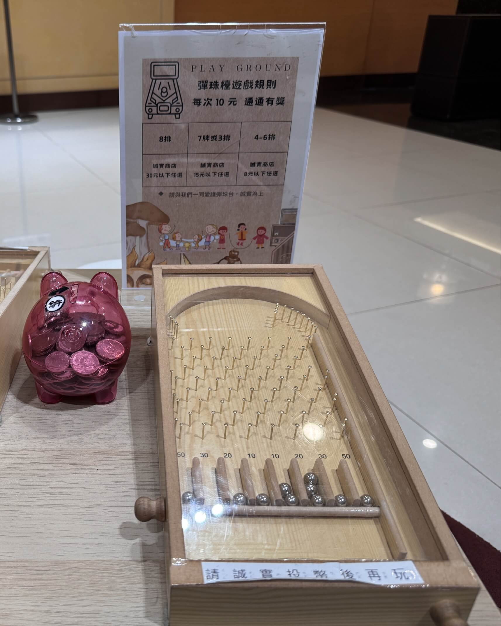 ↓旁邊還有兩台彈珠台,每玩一次先自行投幣10元,依打彈珠得到的分數,決定獎品價值,再自行從旁邊的食品櫃拿取等值的食品,很有趣。