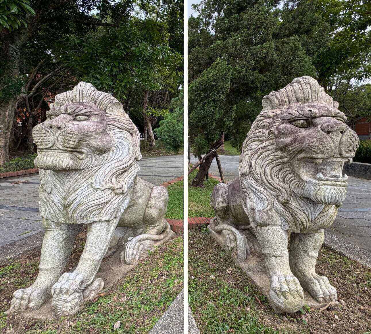 ↓牌樓前,左右一對石獅子,一開口、一閉口,形成有趣的對比。