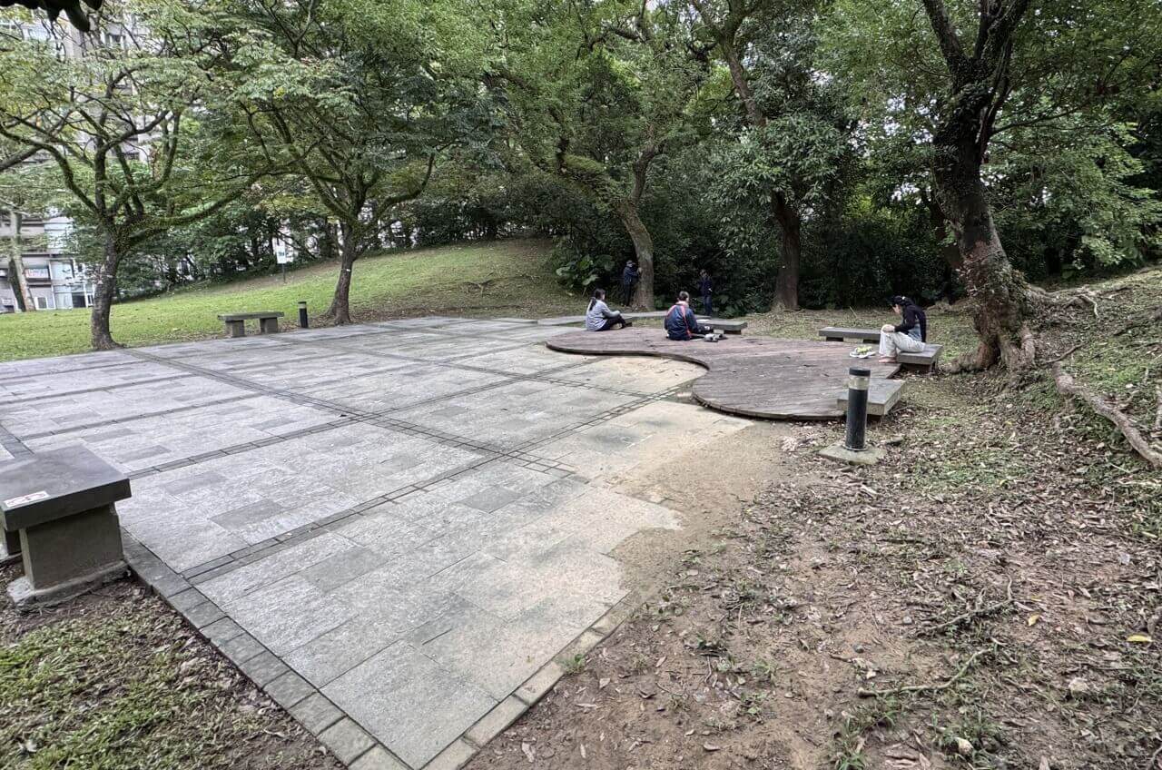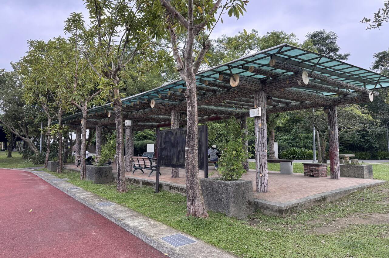 ↓公園的植物相當多,園區略呈長方形,左半部有ㄇ字型的池塘「後山埤」,捷運「後山埤站」之名便是由此而來。我們從右下角的入口廣場走進來。