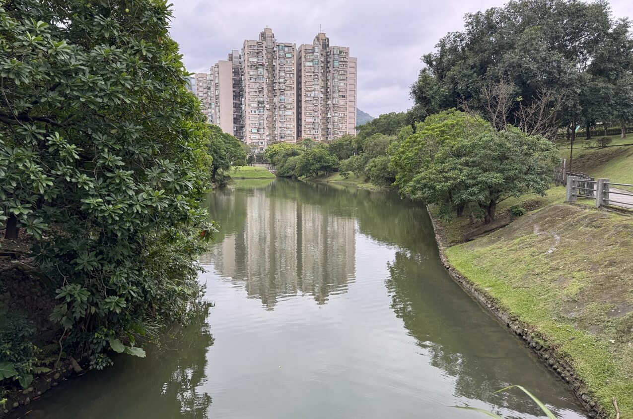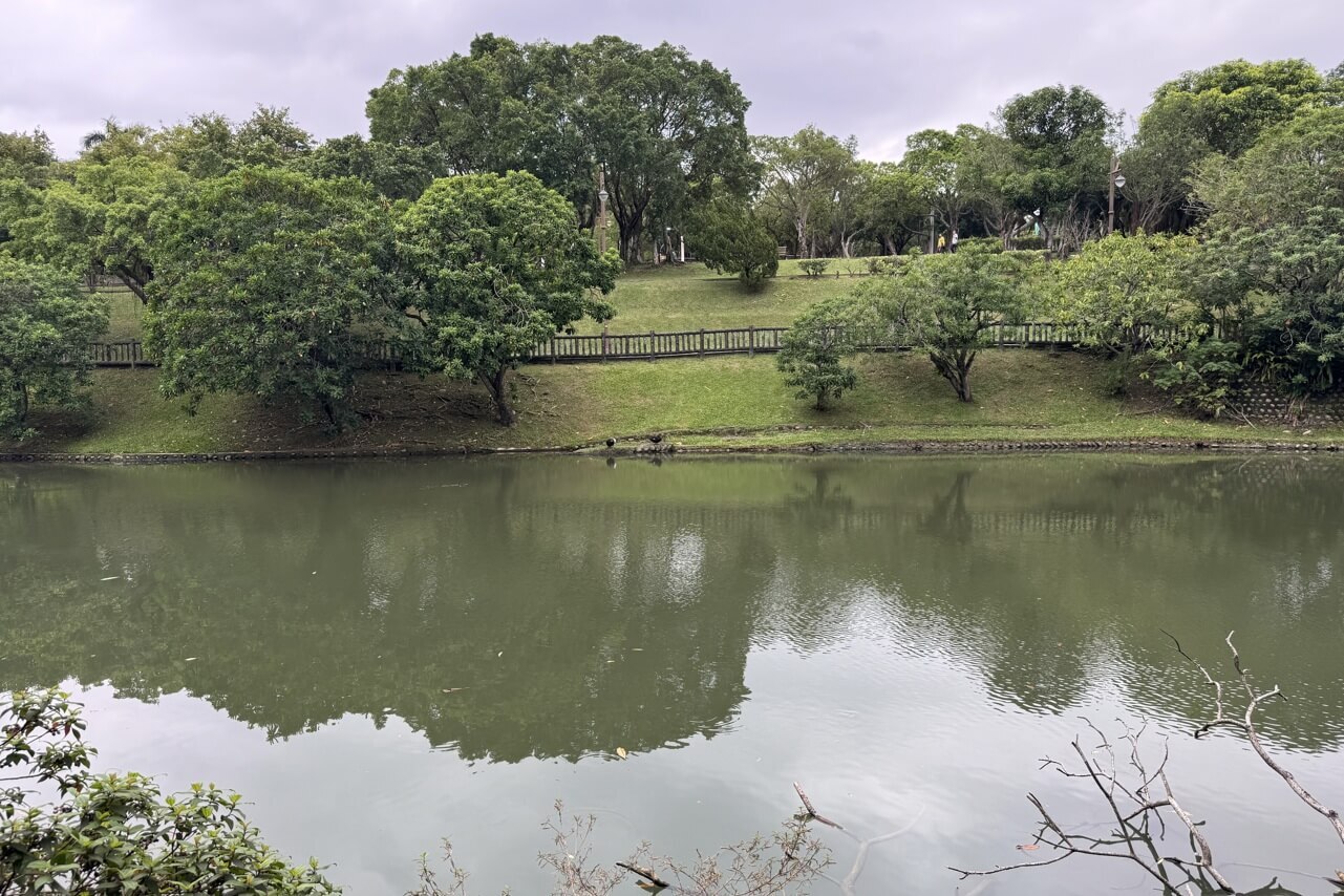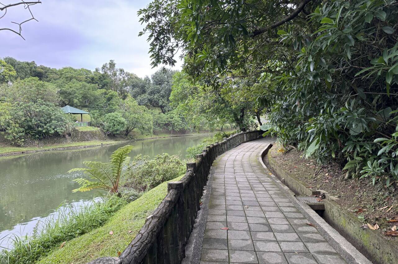 ↓我們沿著「中」線步道走,來到公園尾端,這裡便與公園裡的池塘「後山埤」相接。