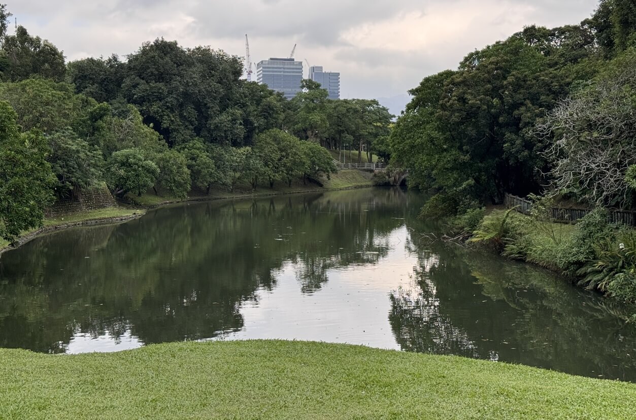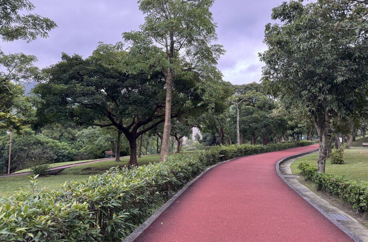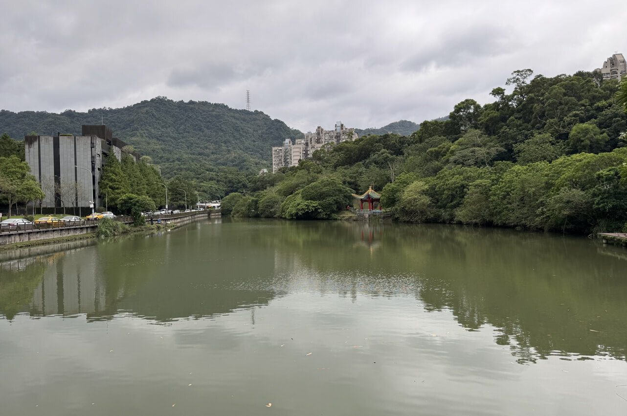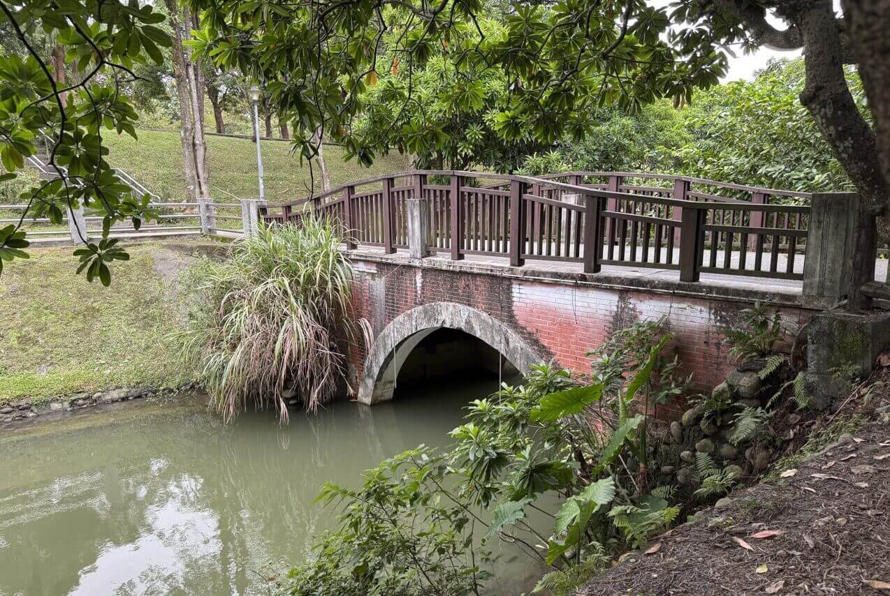 ↓我們沿著「中」線步道走,來到公園尾端,這裡便與公園裡的池塘「後山埤」相接。