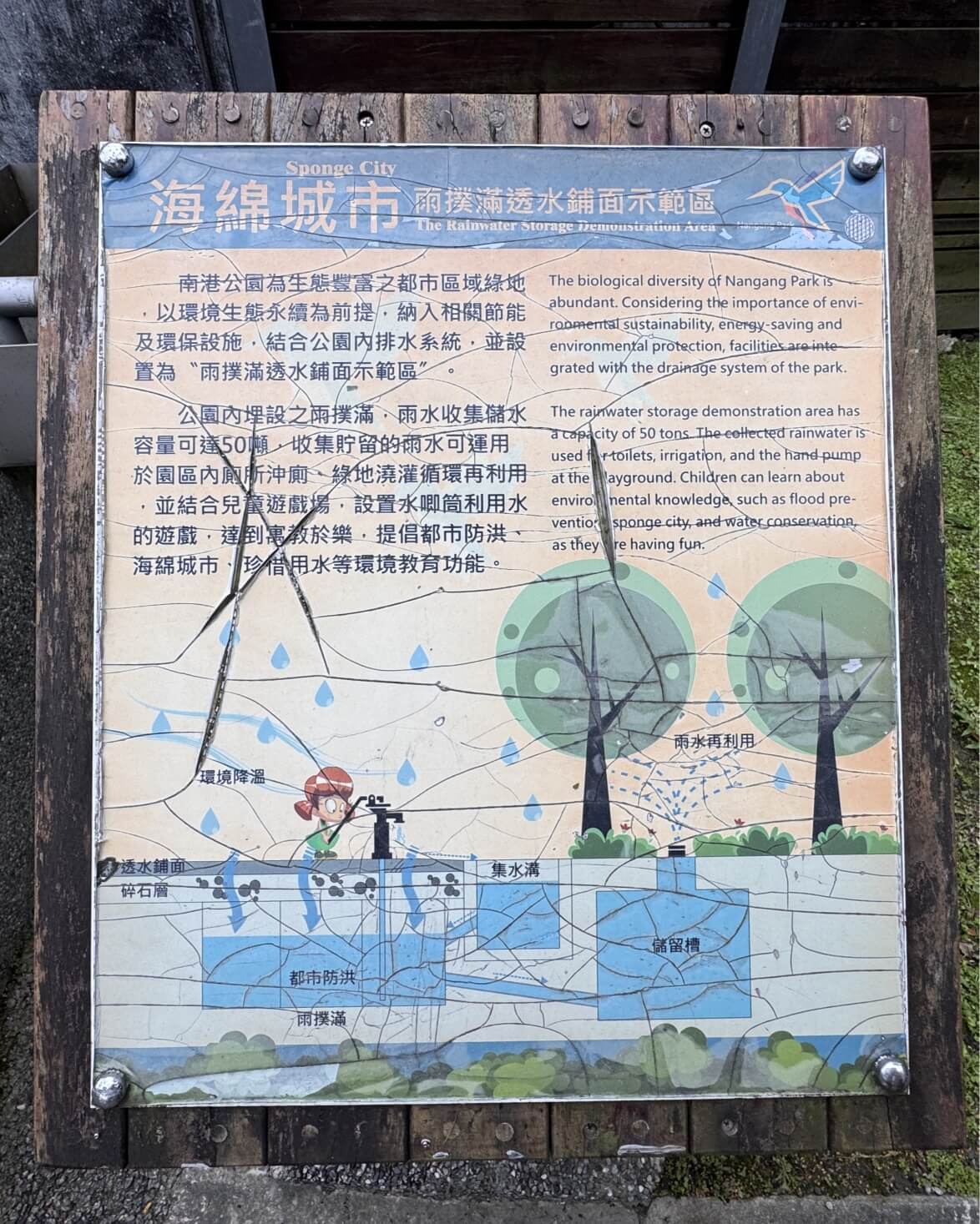 ↓公園裡以環境生態永續為前提,建置了「雨撲滿」設施,貯存雨水,提供公園內之用水。