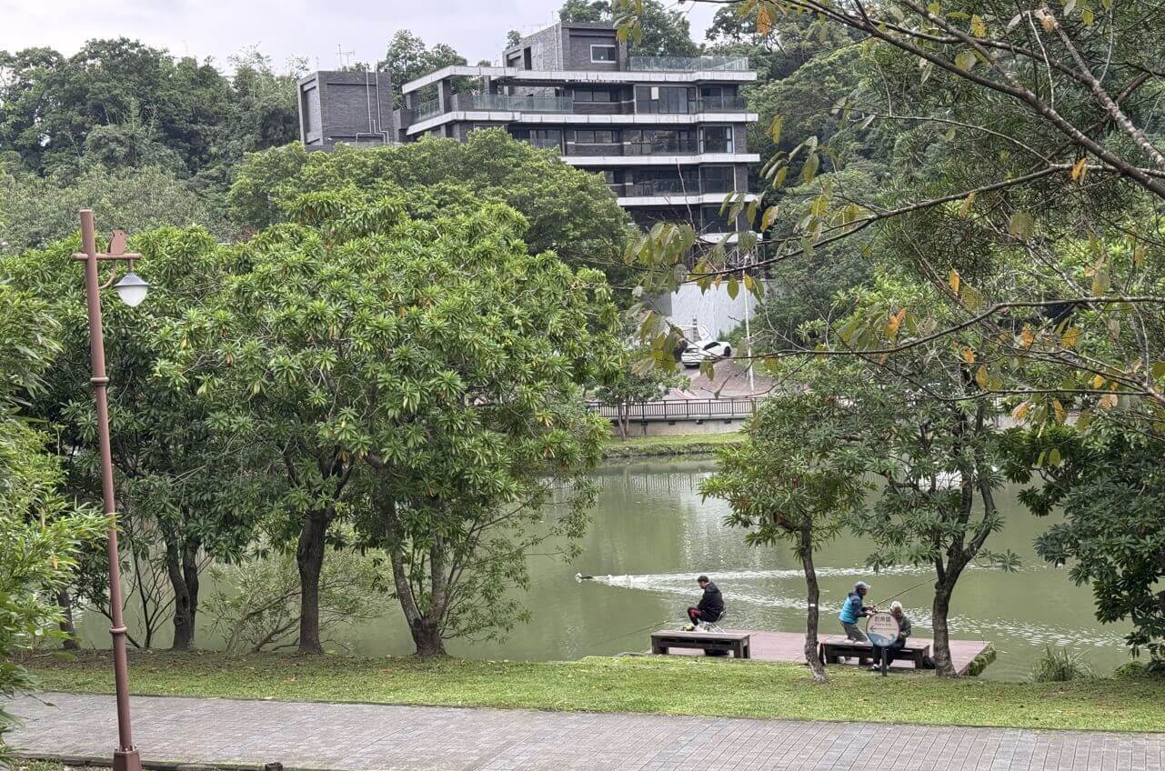 ↓後山埤池水青翠,環境清幽。正前方是南港國宅,左前方則是新建豪宅,都愛這片面湖的景色。