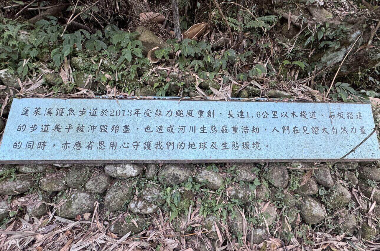 ↓蓬萊溪護魚步道曾在民國102年(2013年)時,遭受蘇力颱風重創,整條木棧道及石板步道幾乎被沖毀殆盡,大自然的反撲,值得我們的深切省思。
