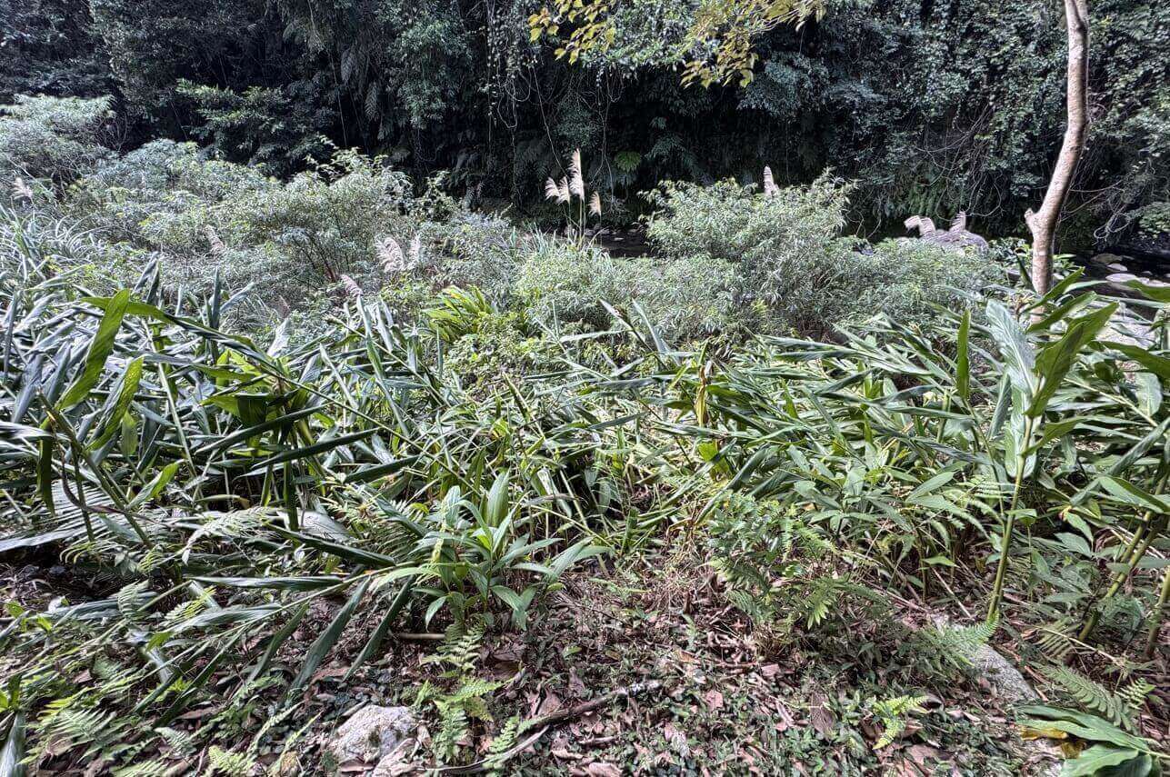 ↓折返皆下坡,更輕鬆了。途中,見到好幾處的野薑花,可惜,花都被採光,而且都有『哺乳類動物』踏扁枝幹的痕跡,東倒西歪的,實在令人痛心!