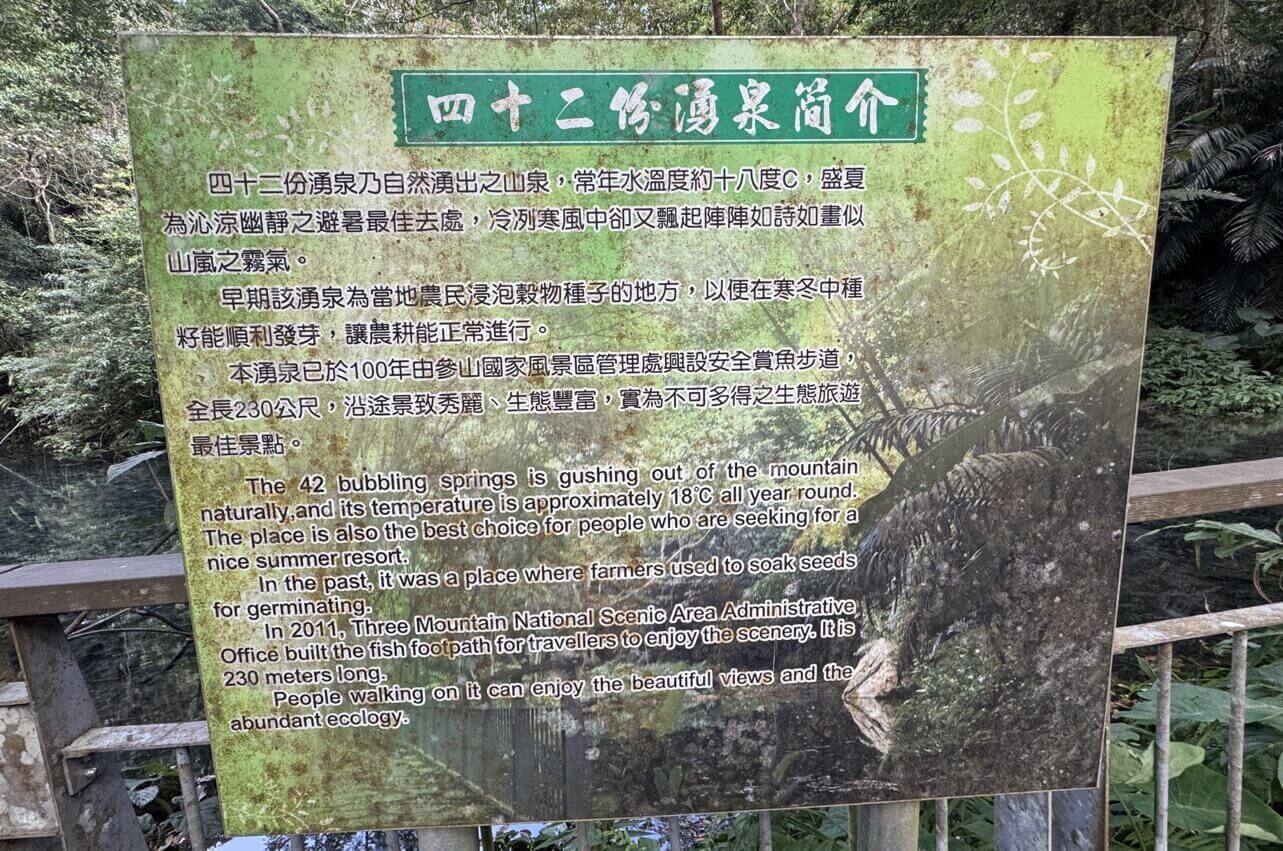 ↓四十二份湧泉也位於蓬萊溪畔,設有觀魚步道,而且步道能環蓬萊溪一圈。