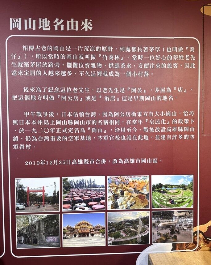↓岡山地名的由來,原是一位老先生築茅屋、擺攤位賣雜物,供應茶水,方便往來的旅客,而稱為『阿公店』。日本時代,因附近的大崗山、小崗山,與日本的岡山市同名,而改稱為『岡山』。光復後,岡山成為台灣重要的空軍基地。