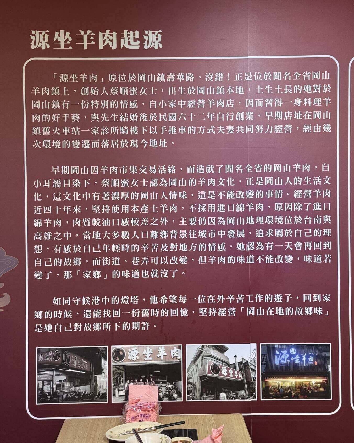 ↓「源坐羊肉」的創始人蔡順蜜女士,是土生土長的岡山人,自小習得一身料理羊肉的好手藝。源坐羊肉創於民國62年(1973年),原僅是以手推車的方式於騎樓下經營,後經營有成而落居於現址。店內堅持使用來自岡山本地的羊肉,是蔡女士對岡山羊肉文化(岡山在地的故鄉味)的堅持及期許。