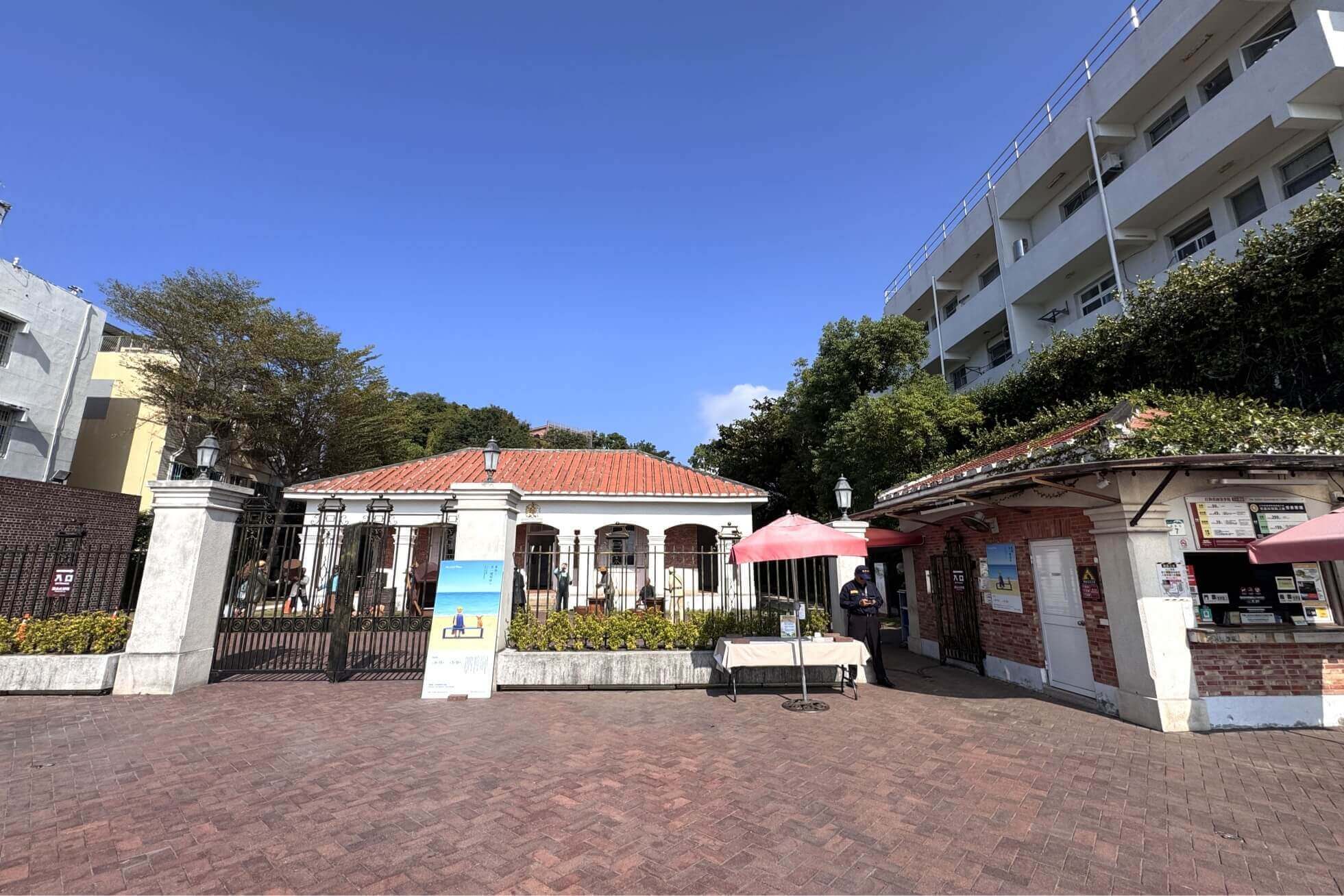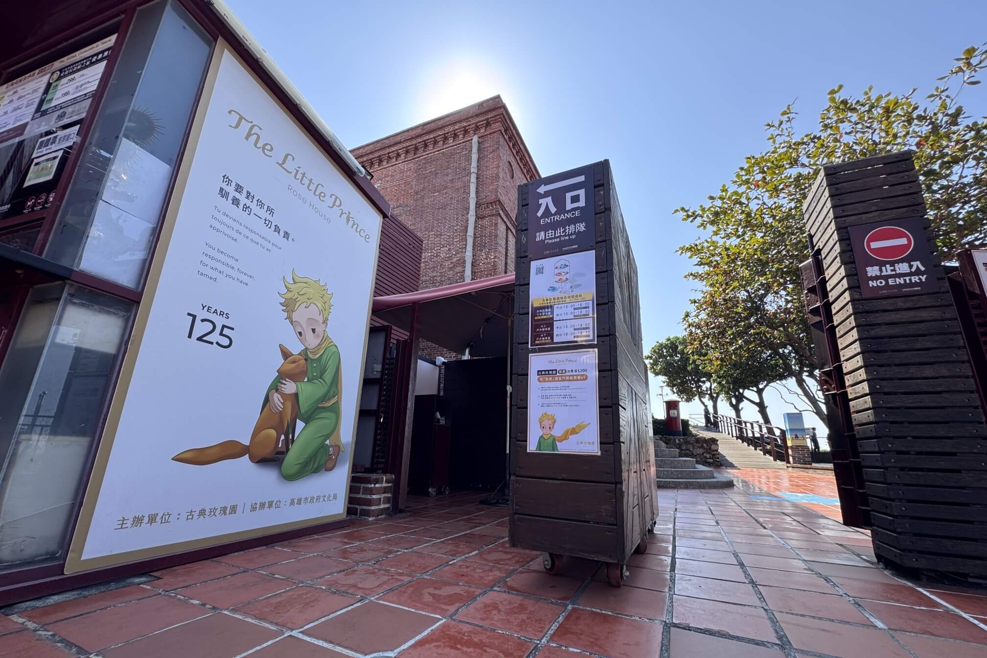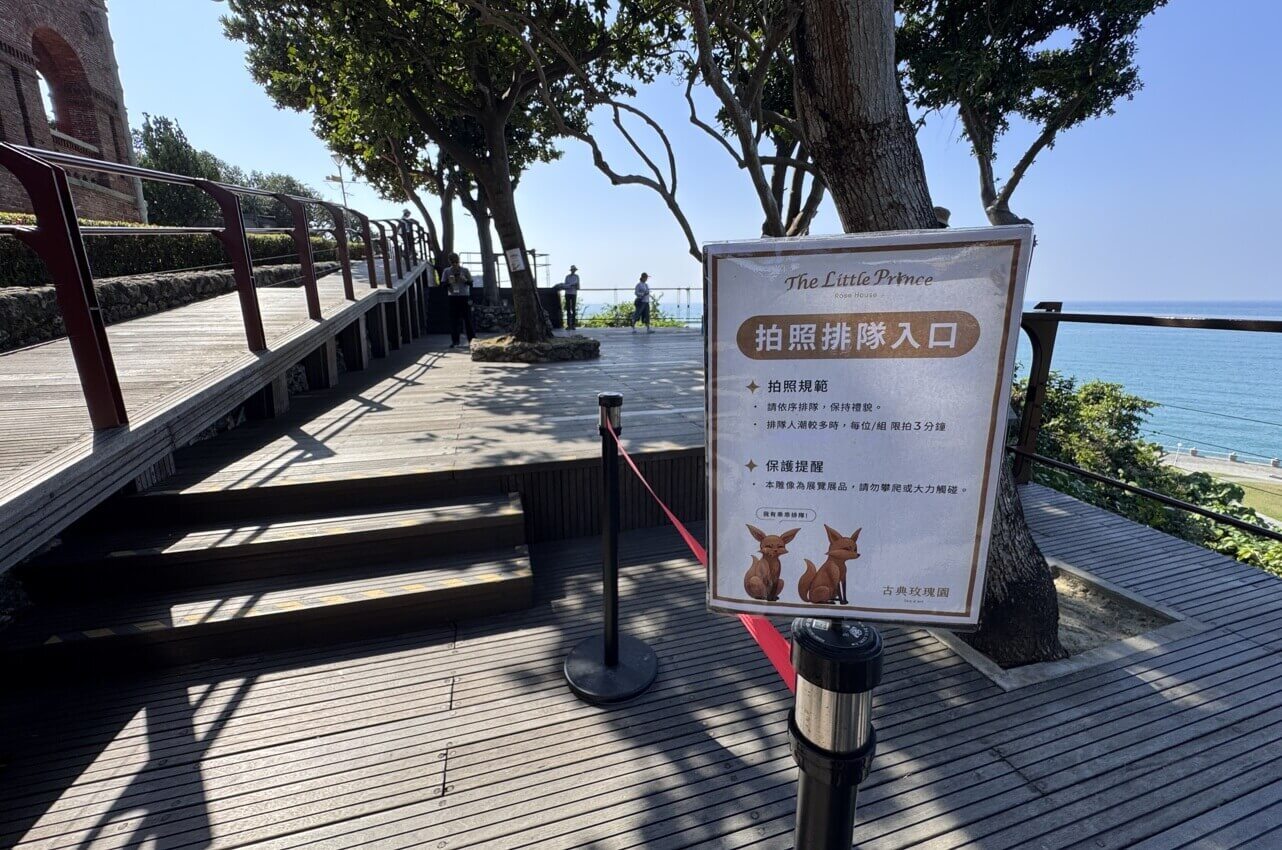 ↓回到領事館官邸後側觀景平台,這裡有拍照排隊入口導引牌。原來,假日遊客較多時,眾人要與小王子拍照,需要從這裡往前排隊呢!