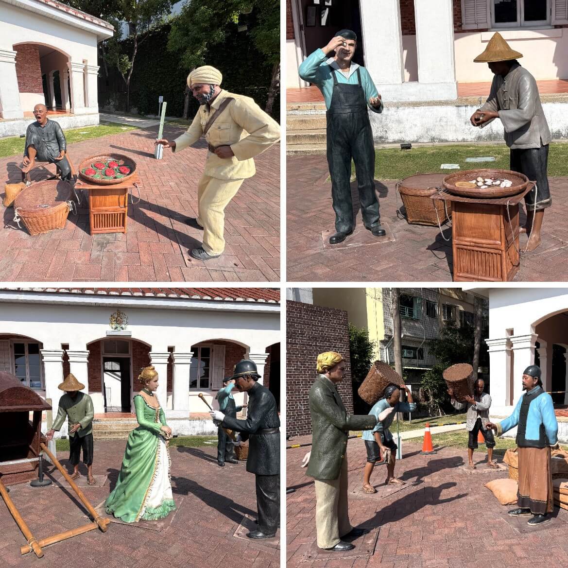 ↓重現哨船頭的街景:(左上)小販兜售台灣特有的小吃;(右上)小販兜售台灣特有的小吃;(左下)領事夫人出門;(右下)官員進出忙碌的哨船頭碼頭。