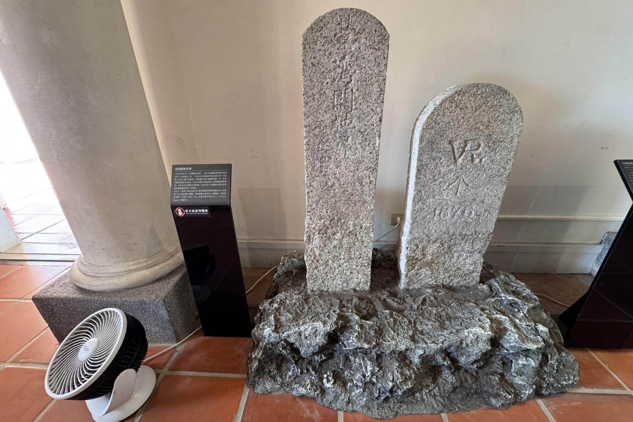↓這是設立於1869年、與隔壁海關宿舍的界碑「臺灣關地界碑」,為打狗設關開港時期的三座界碑之一,另兩座目前分別存於臺北海關博物館及高雄歷史博物館。界碑上刻有「VR」,是當時英國維多利亞女王(Victoria Regina)的縮寫。