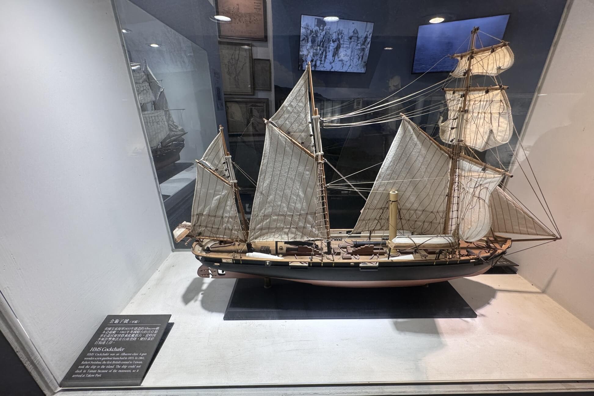 ↓這艘是「金龜子號(HMS Cockchafer)軍艦」,英國皇家海軍1855年建造的Albacore級木造砲艇。1861年英國駐台首位領事史溫侯(Robert Swinhoe)曾搭乘此艦抵台,當時因季風影響無法在台南登陸,便停靠於打狗港上岸。
