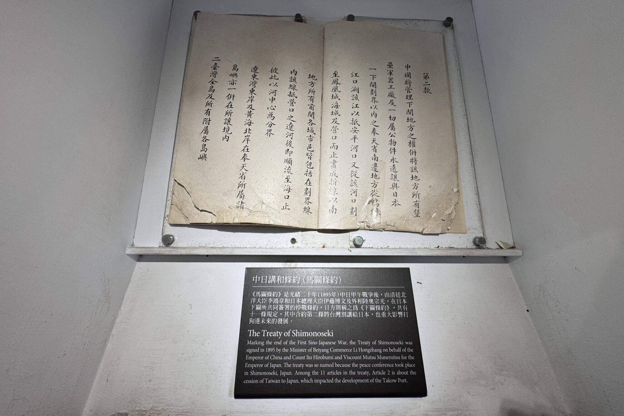 ↓《中日講和條約(馬關條約)》,中日甲午戰爭後簽訂的《馬關條約》,條約中的第二款第二條,將台灣割讓給日本,也為打狗港未來的發展產生重大的影響。