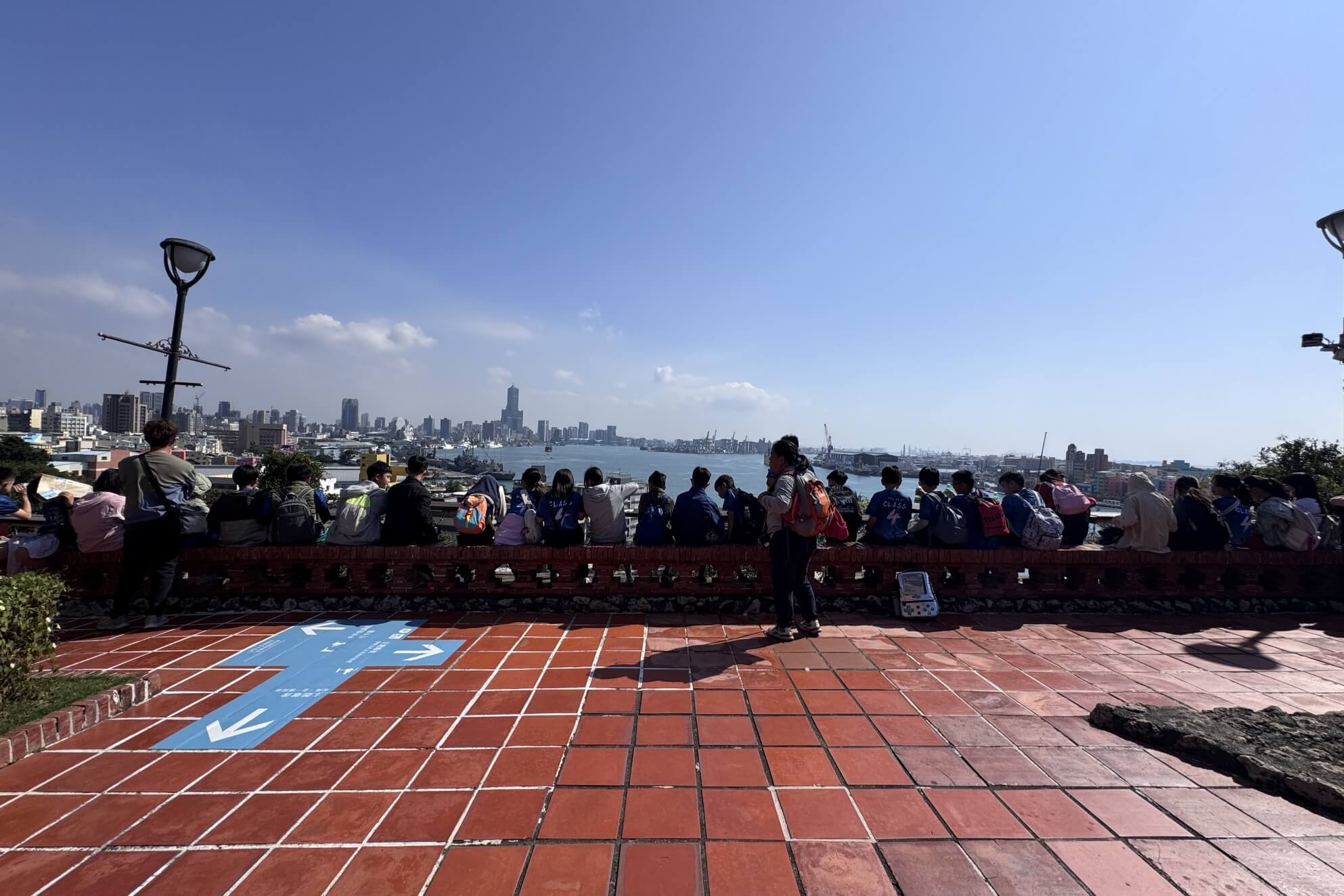 ↓來了一群小朋友,在老師的導引下,齊坐矮牆上,望向高雄港區,除了滿滿的希望外,更顯活力無限。