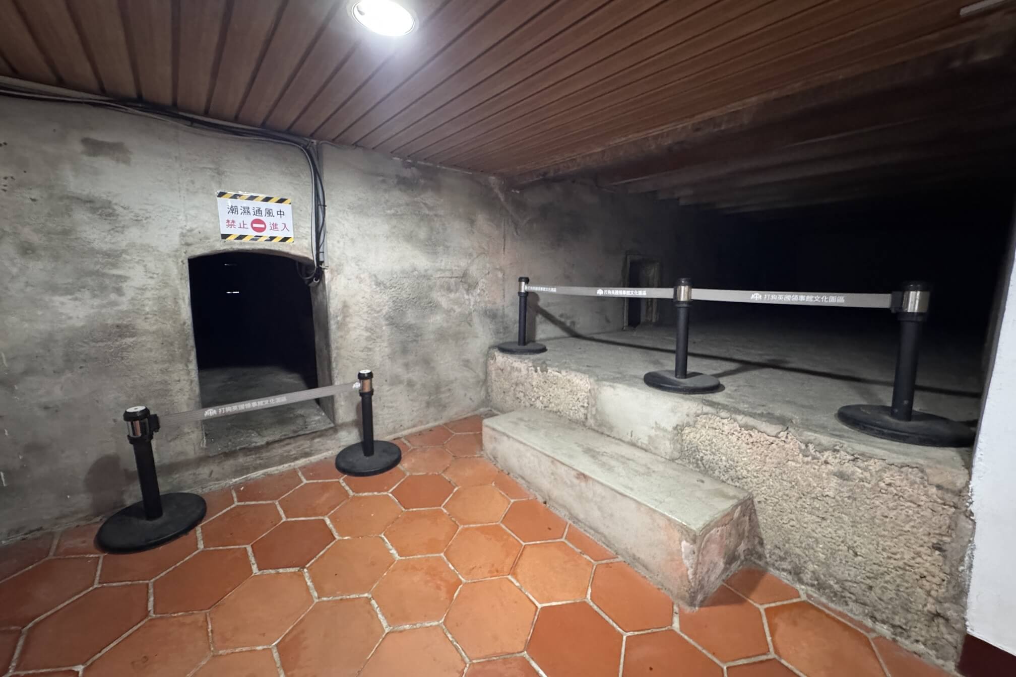 ↓日本時代建造的防空洞。防空洞前方區域,則是以前領事館的牢房遺址,當時英國人在台犯罪,是接受英國的法律審判與制裁的,若有拘禁,也是關在這裡。