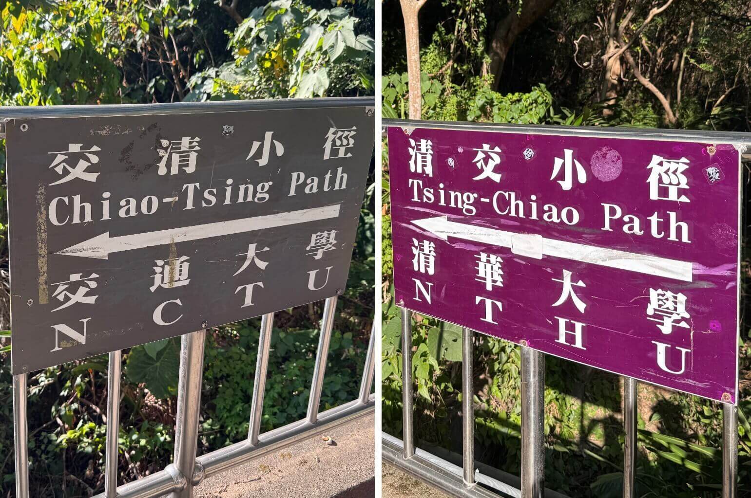 ↓小徑兩旁有兩塊路牌,呈現『一條小徑,各自表述』的有趣景象。往交大這一頭,寫著「交清小徑」;往清大這一頭,則寫著「清交小徑」。這種互爭排名、互不相讓的現象,在兩校間有幾十年歷史的「梅竹賽」期間,更是屢見不鮮,是每個交清人/清交人學生時代的美好青春回憶。