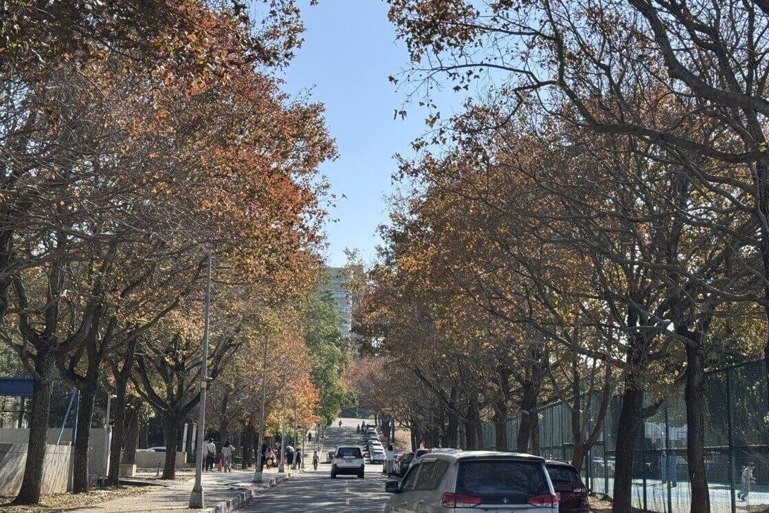 ↓我們從新竹火車站搭2號公車,直達陽明交大(以下簡稱交大)的光復校區。一路走到排球場與籃球場間的小路,兩旁都是楓紅,今冬也終於算賞過楓紅了。