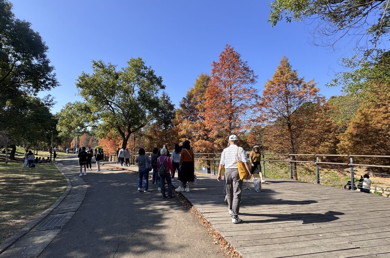 ↓轉進小徑,感覺好像所有的遊客都往同一個方向走,莫非都是來看落羽松的?前方已經看到黃黃一片了。
