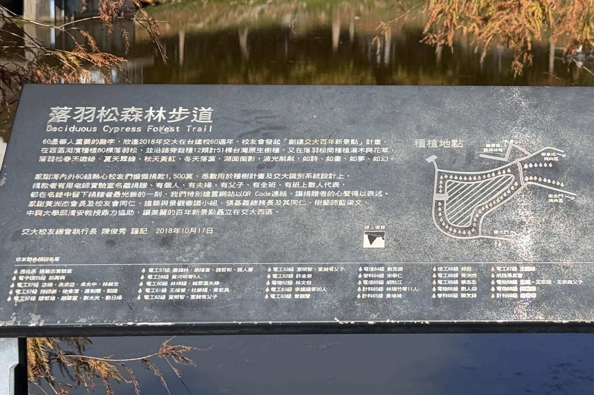 ↓這條落羽松森林步道,有60棵落羽松,是2018年交大在台復校60周年紀念時,由校友會認捐種植的,底下有認捐的校友名單。