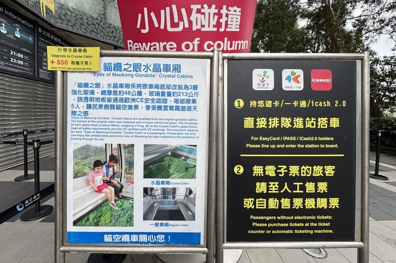 ↓可用悠遊卡、一卡通、icash 2.0直接上纜車,或在櫃檯、自動售票機購票。除了一般車廂外,貓纜有提供「貓纜之眼-水晶車廂」,每人需加收50元,腳下有透明車廂,可以透視車廂下的風光,享受翱翔天際、騰雲駕霧快感。