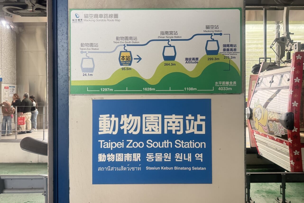 ↓貓纜從山下的動物園站上山,沿途經過「動物園南站」、「指南宮站」及終點站「貓空站」,頭尾兩站高度落差約275公尺,水平距離全長約4033公尺,算很長的。